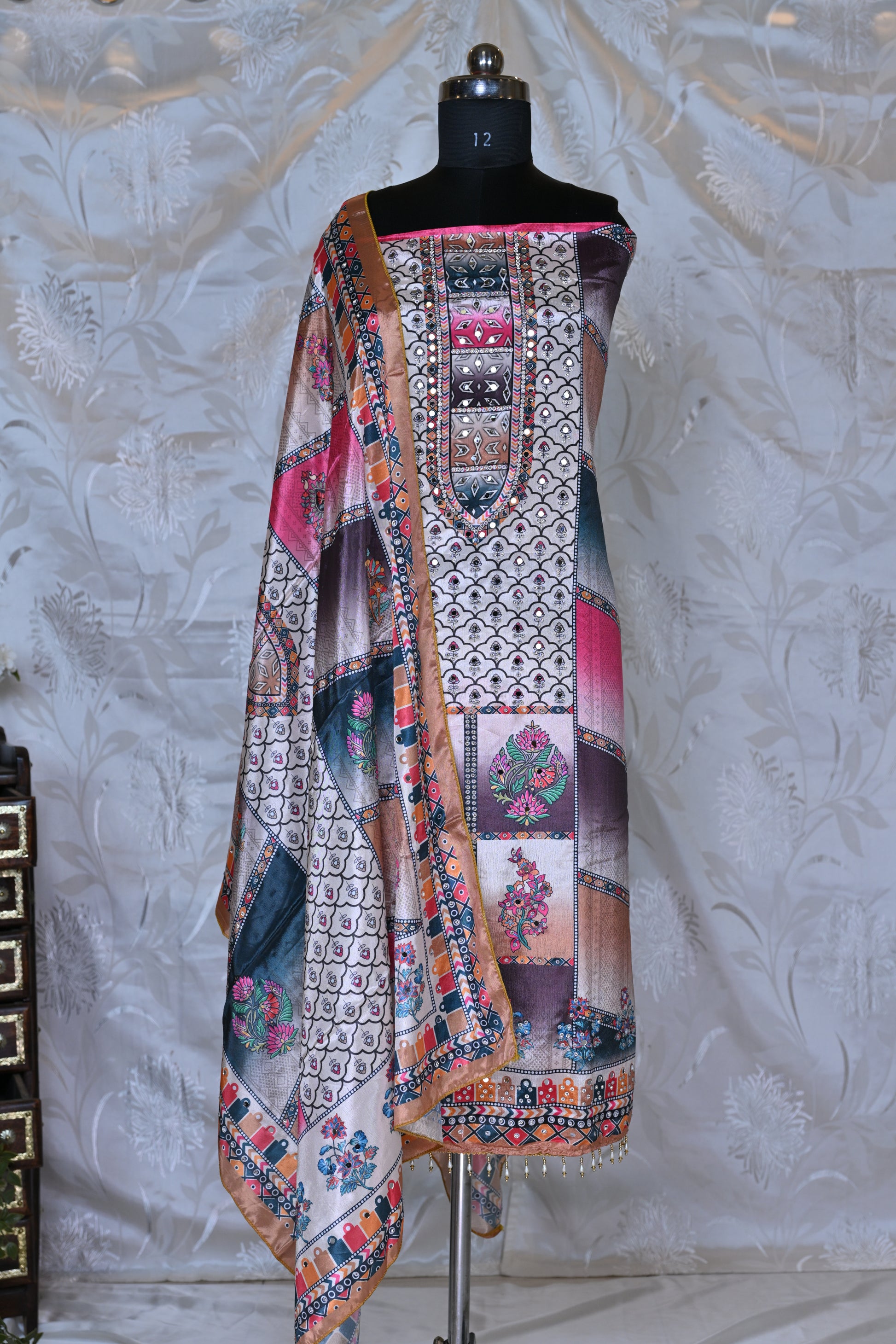 Color: Multi-color digital print featuring shades of Brown, Plum, Teal, Fuchsia, Cream, with accents of Orange and Pink. Material: Digital Printed Fabric (likely Silk Blend, Crepe, or High-Quality Cotton Satin - can be specified if known). Embellishment: Intricate Mirror Work on the neckline. Set Includes: Unstitched Kurta Fabric, Printed Matching Dupatta (Bottom fabric not explicitly visible in image, but typically included in a suit set. Adjust if only top and dupatta are provided.)