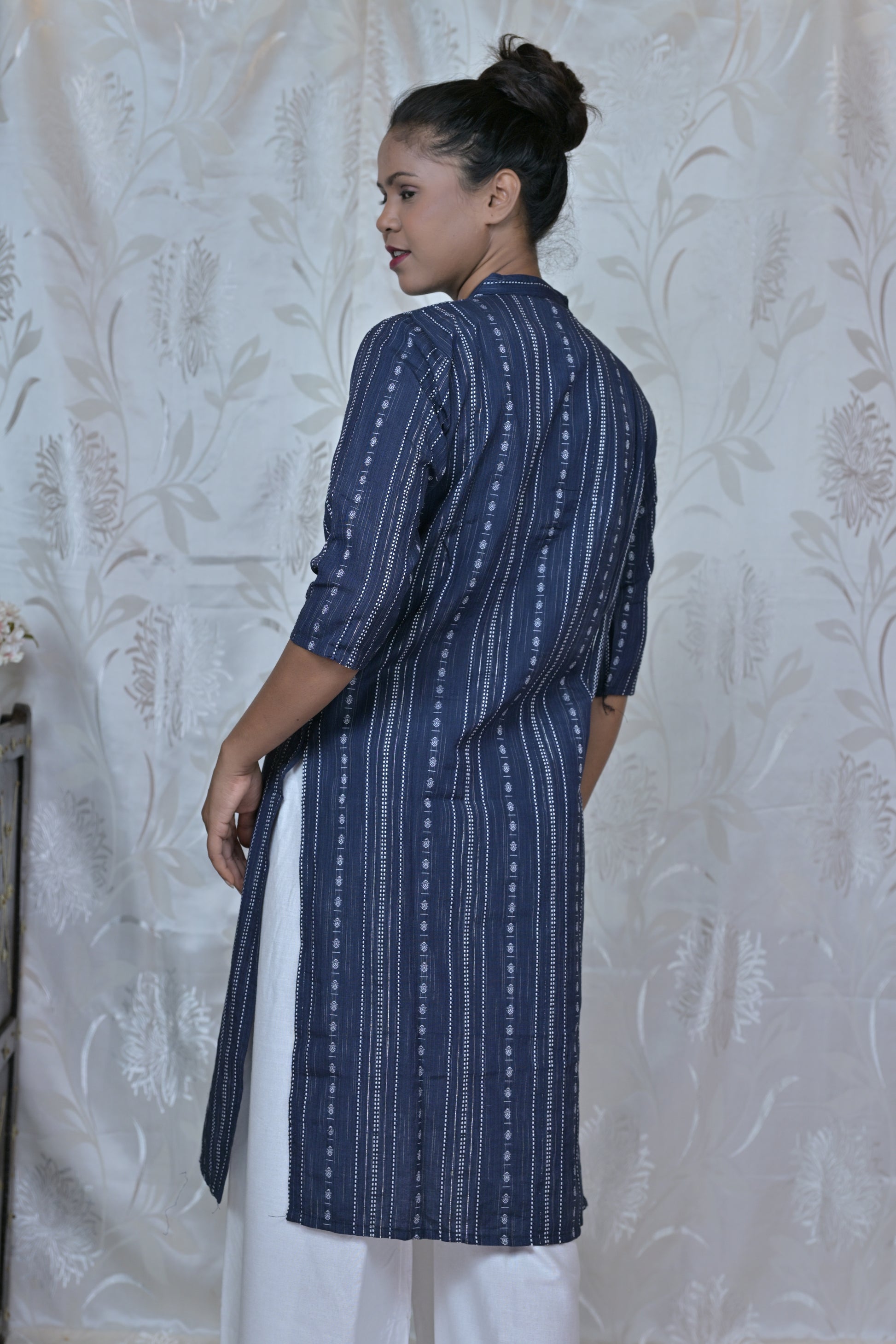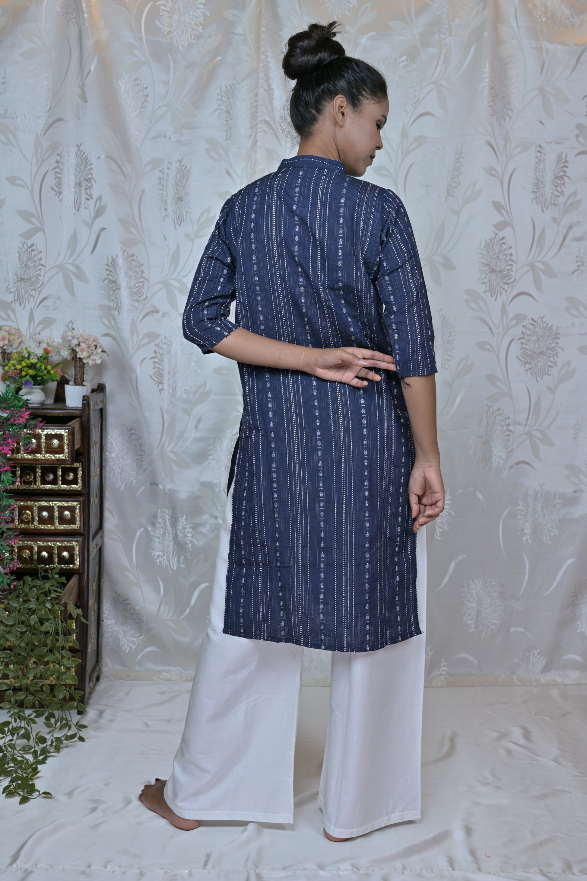Embrace effortless style and comfort with our Azure Comfort Striped Kurta, a perfect addition to your daily wear collection. This elegant kurta features a sophisticated deep blue hue adorned with subtle white vertical stripes, creating a timeless and flattering look. Designed for ease of movement and all-day comfort, it's an ideal choice for your busy routine , whether you're at the office, running errands, or enjoying a casual outing.