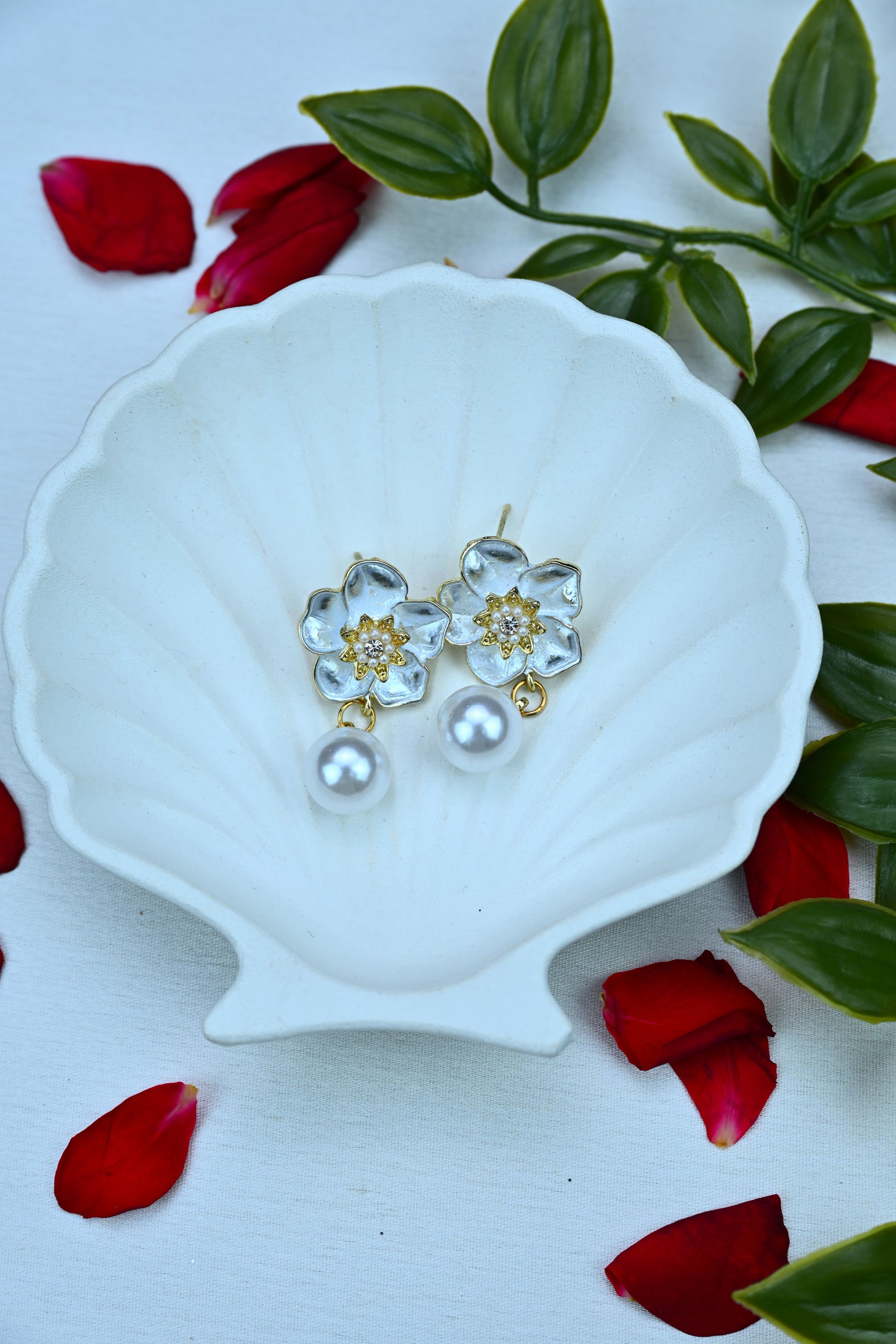 Elevate your look with our Blossom Pearl Drop Earrings, featuring delicate silver-toned enamel flowers with golden, gem-studded centers. A luminous faux pearl dangles gracefully below, adding timeless elegance to this nature-inspired design.