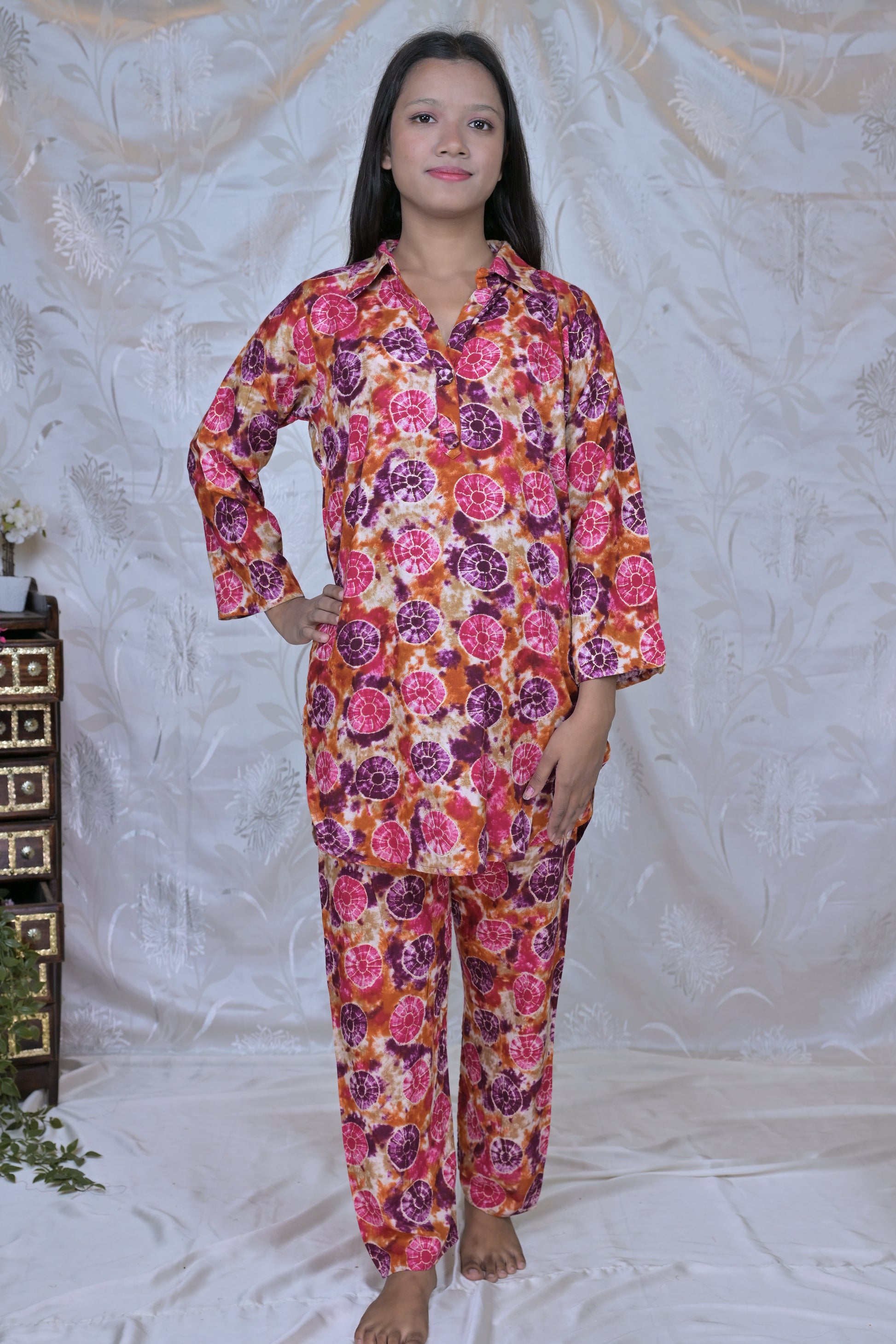 This co-ord set showcases a rich and playful color palette. The predominant background colors are a warm and inviting blend of peachy oranges, rustic browns, and soft creams, creating a beautiful canvas. Adorning this base are abstract circular and swirling patterns in various shades of vibrant fuchsia, deep berry, and rich plum, with hints of the lighter background colors subtly appearing within the design. This harmonious mix of warm and cool tones gives the set a distinctive, artistic, and effortlessly chic appeal.