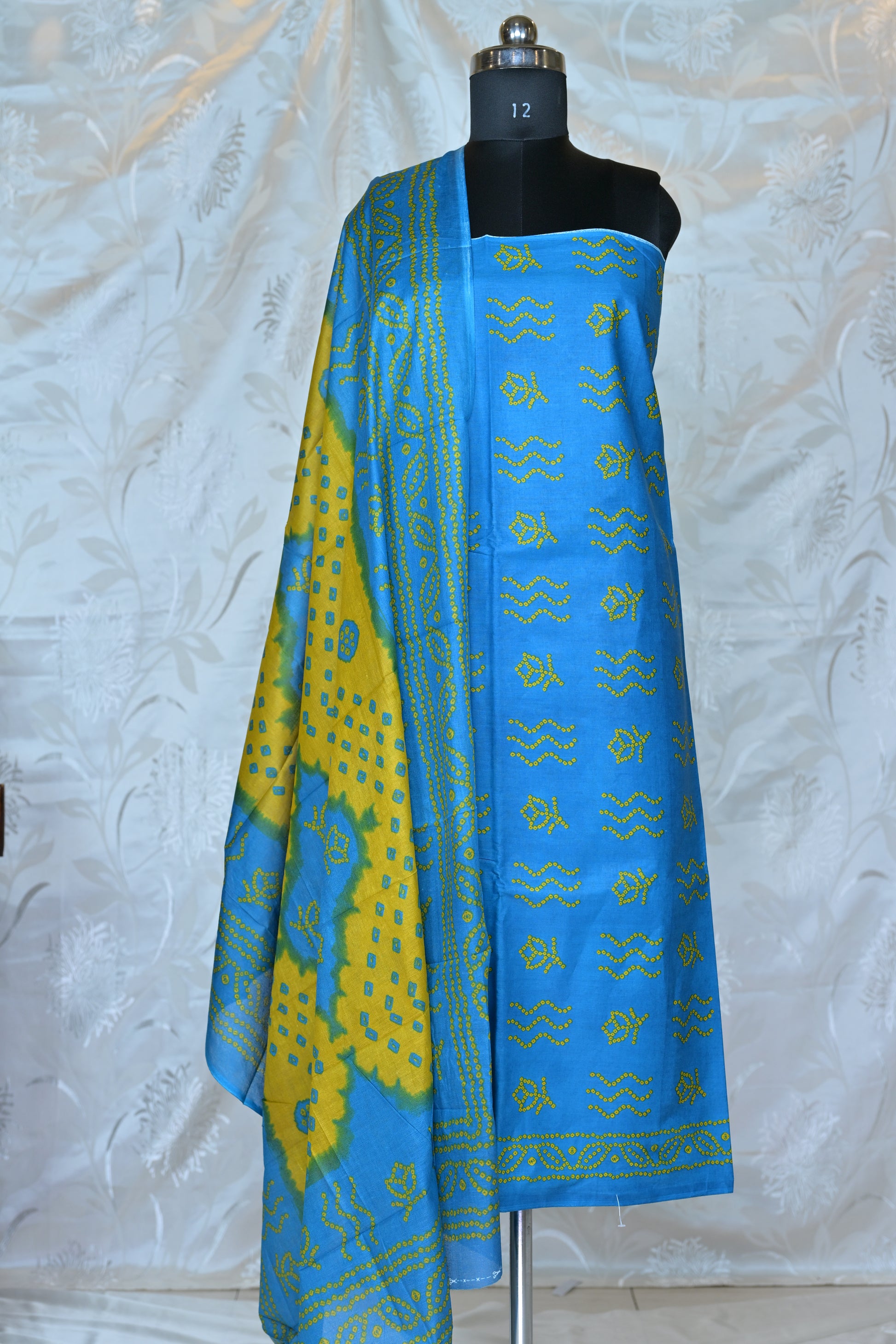 The shirt piece is covered in charming dotted motifs, forming delicate fish and wave-like shapes in bright yellow, creating a lively and textured effect. The design features a subtle border along the hem. The accompanying dupatta is a bold and complementary statement, primarily in a sunny yellow with blue Bandhani dots and elaborate geometric borders. This striking contrast with the blue shirt creates a beautiful visual appeal, ensuring a graceful drape and eye-catching presence. The set also includes a coordinating bottom fabric (likely a solid blue or a complementary yellow) to complete your customized ensemble.