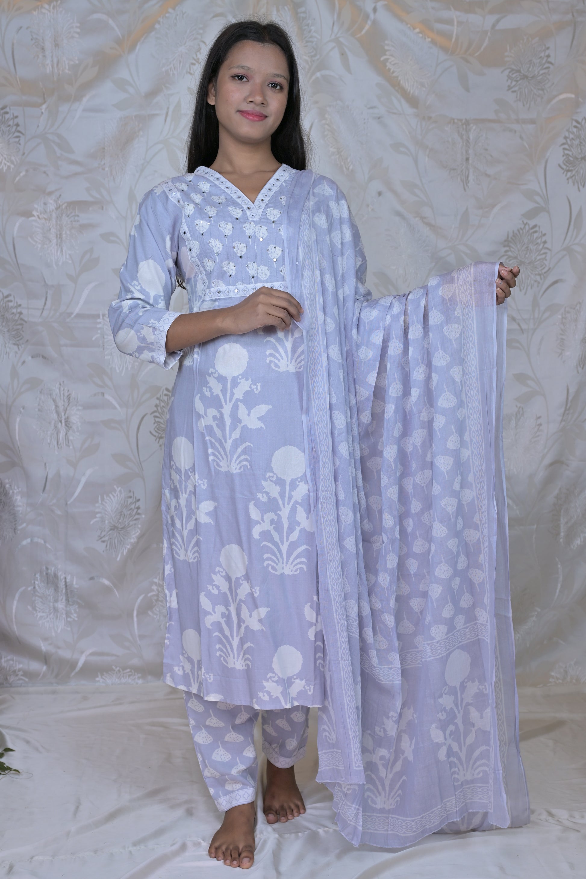 Step out in effortless style with our ready-to-wear 3-piece suit set, combining traditional block prints with delicate embroidery. This comfortable and chic ensemble is perfect for daily wear, casual outings, or adding a touch of elegance to your everyday look.