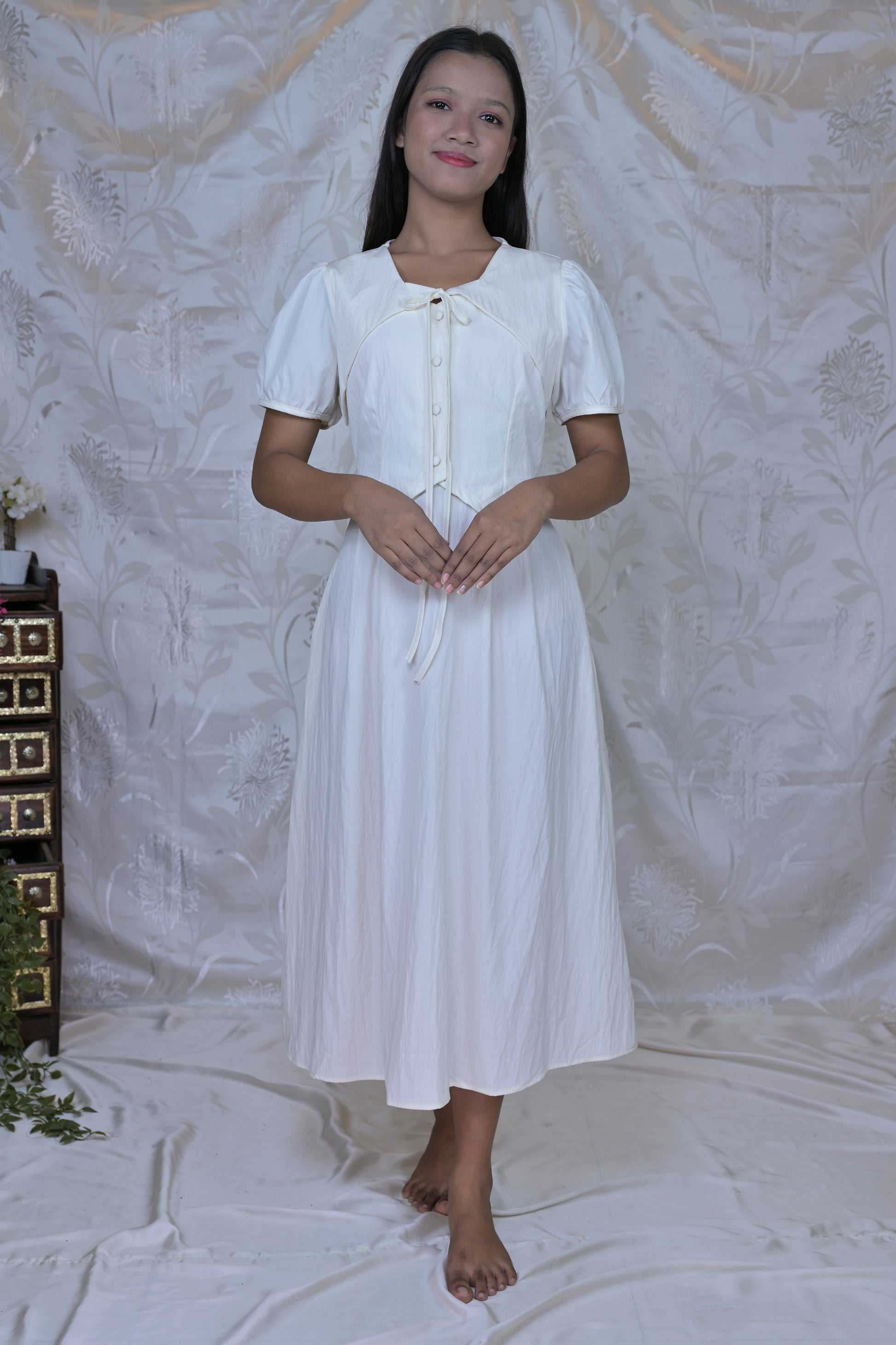 - Bodice Details: Features a decorative button-front placket on the bodice, accompanied by delicate tie-up details at the waist/bodice, allowing for a personalized fit and added visual interest.