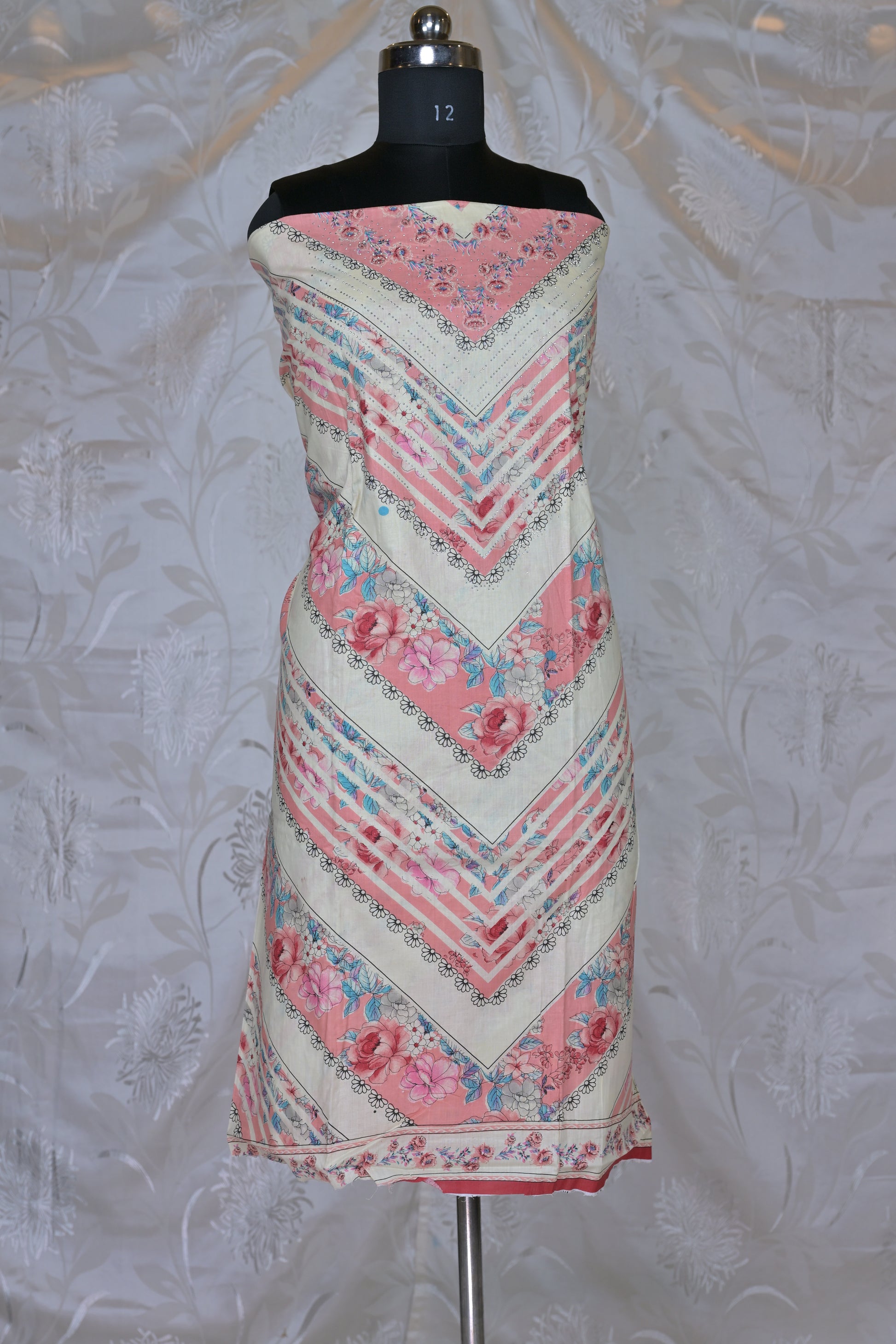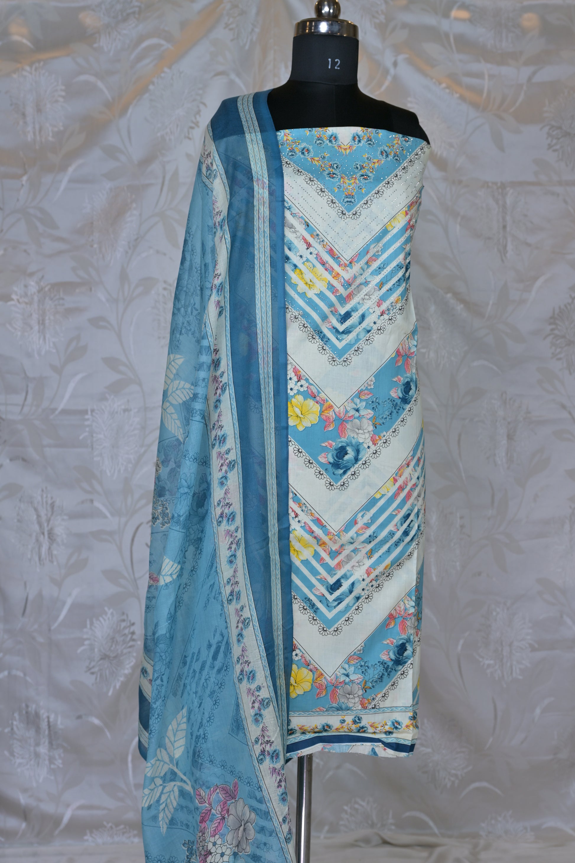 Step into style with our contemporary 3-piece unstitched suit material, featuring a captivating blend of modern chevron patterns and delicate floral prints. This versatile fabric set allows you to create a personalized ensemble perfect for casual outings, office wear, or relaxed social gatherings.