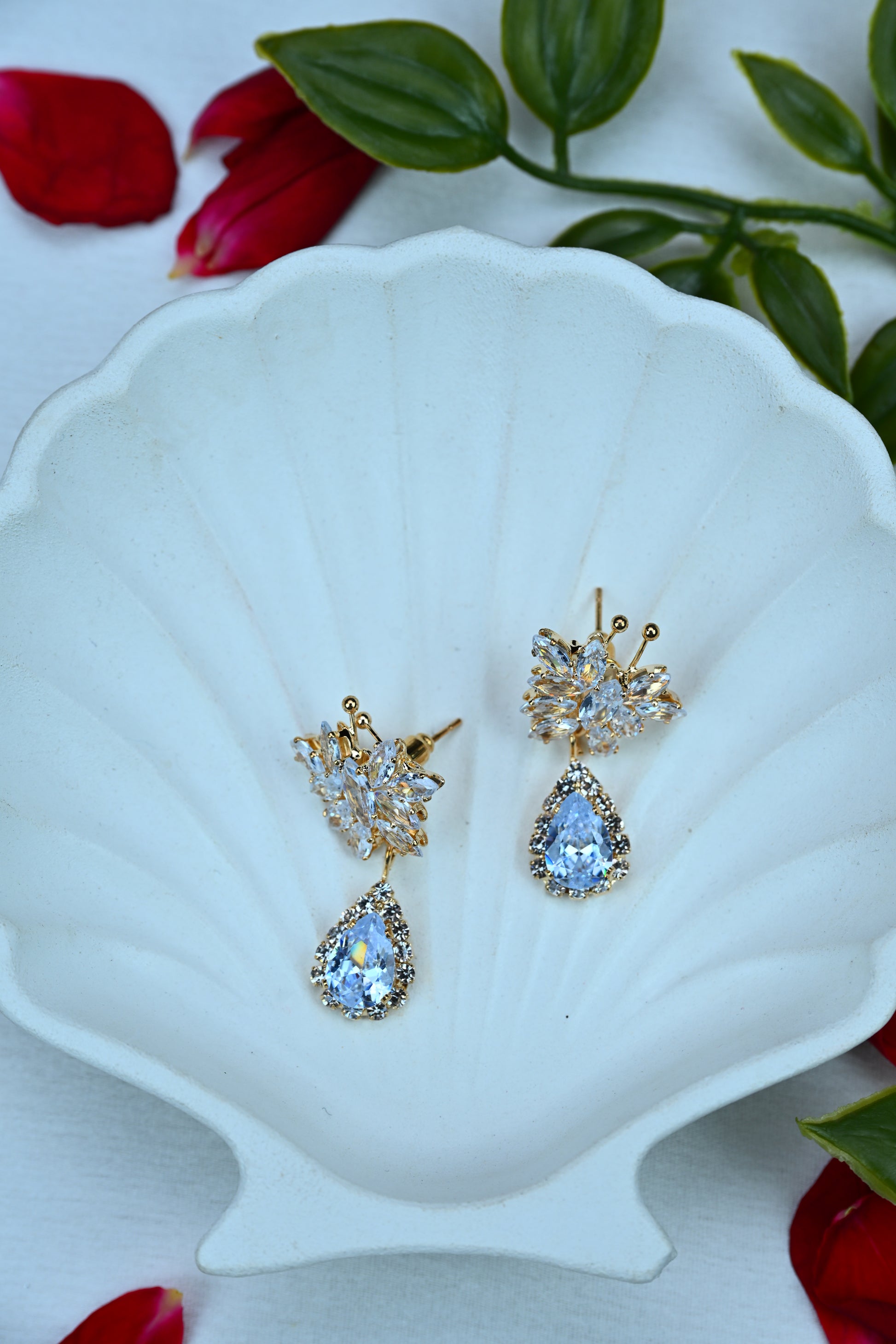 Make a dazzling statement with our Crystal Bloom Drop Earrings — where elegance meets brilliance. These earrings feature a radiant floral cluster of marquise-cut zirconia stones that bloom into a stunning teardrop crystal drop, catching the light from every angle.