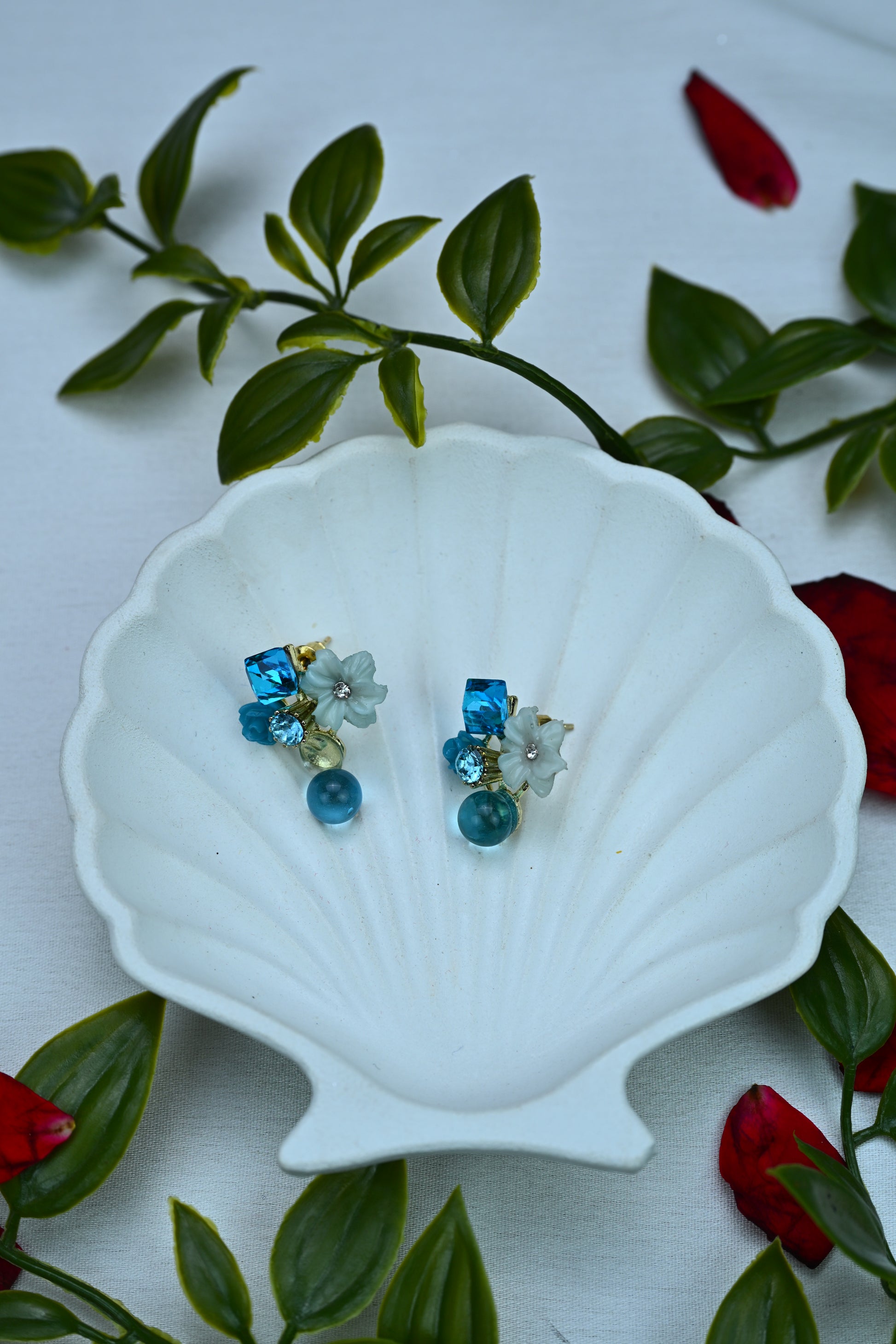 Dive into a serene palette with these enchanting stud earrings, featuring delicate floral accents and radiant blue gemstones. The calming hues of aqua, icy blue, and seafoam green blend effortlessly with the soft floral design, evoking the freshness of ocean breezes. A graceful accessory for both casual days and elegant evenings.