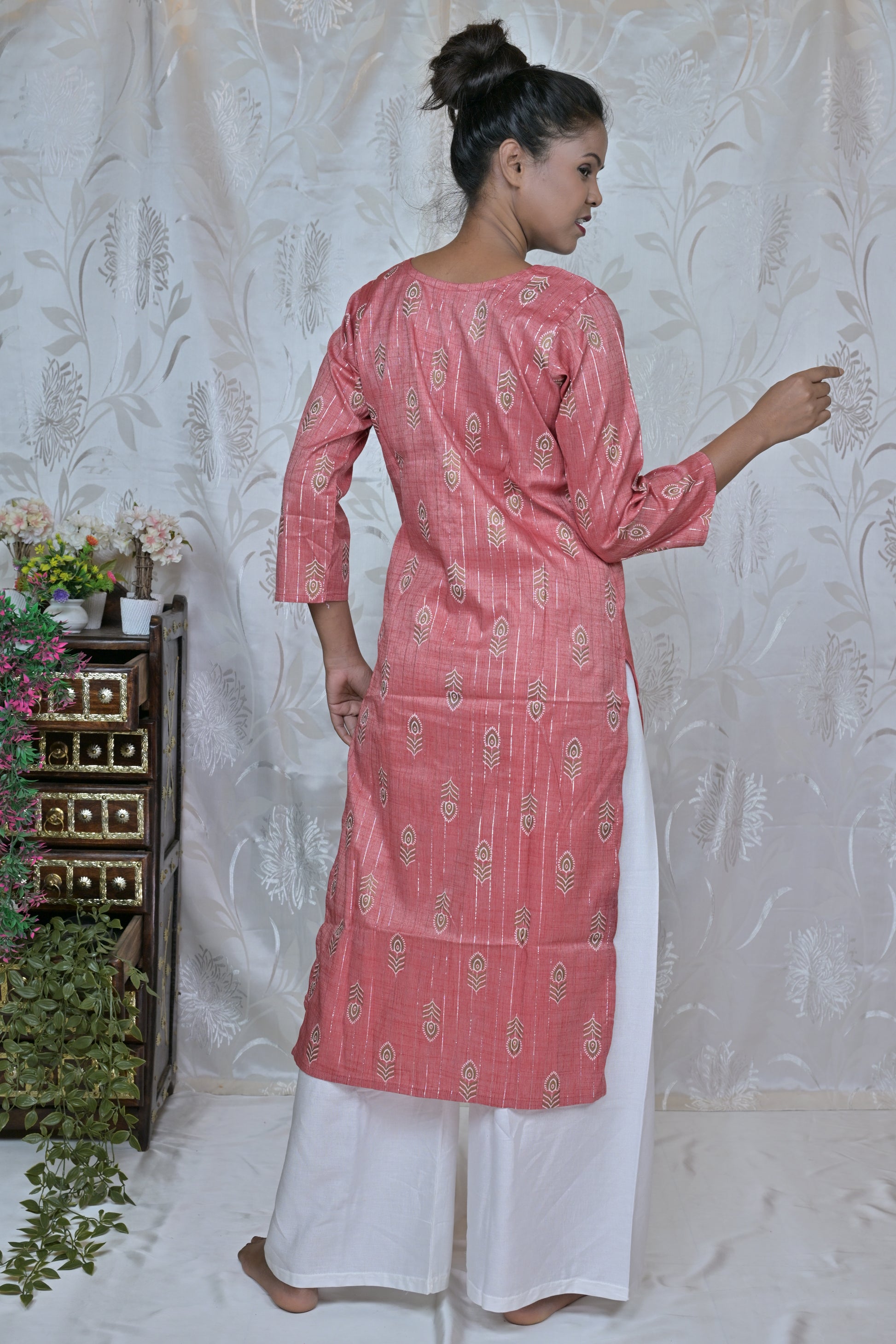 Introducing our exquisite Desert Rose Printed Kurta, a perfect blend of traditional charm and modern comfort. This beautiful kurta comes in a captivating shade of desert rose (a muted reddish-pink/peach with subtle terracotta undertones), adorned with elegant vertical patterns and individual motifs in a contrasting lighter, possibly golden or off-white, tone. Its rich color and intricate design make it a versatile piece that can elevate your everyday look or be styled for more special occasions.