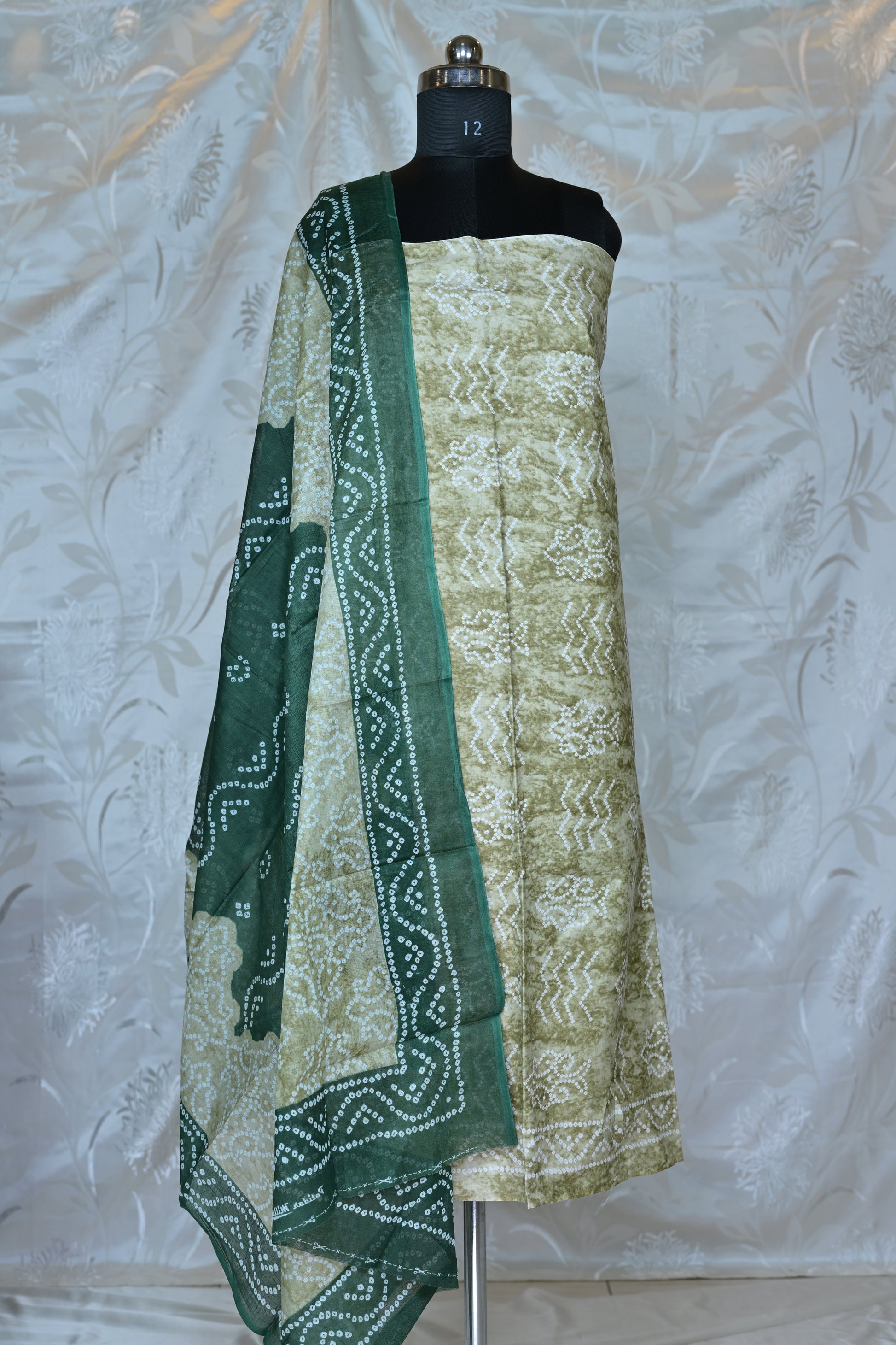 The highlight of this ensemble is the accompanying dupatta, which showcases a traditional Bandhani (tie-dye) inspired print in a rich, dark green on a lighter background. The dotted patterns and distinctive borders on the dupatta offer a beautiful contrast and traditional charm, ensuring a graceful drape. The set also includes a coordinating bottom fabric to complete your customized ensemble.