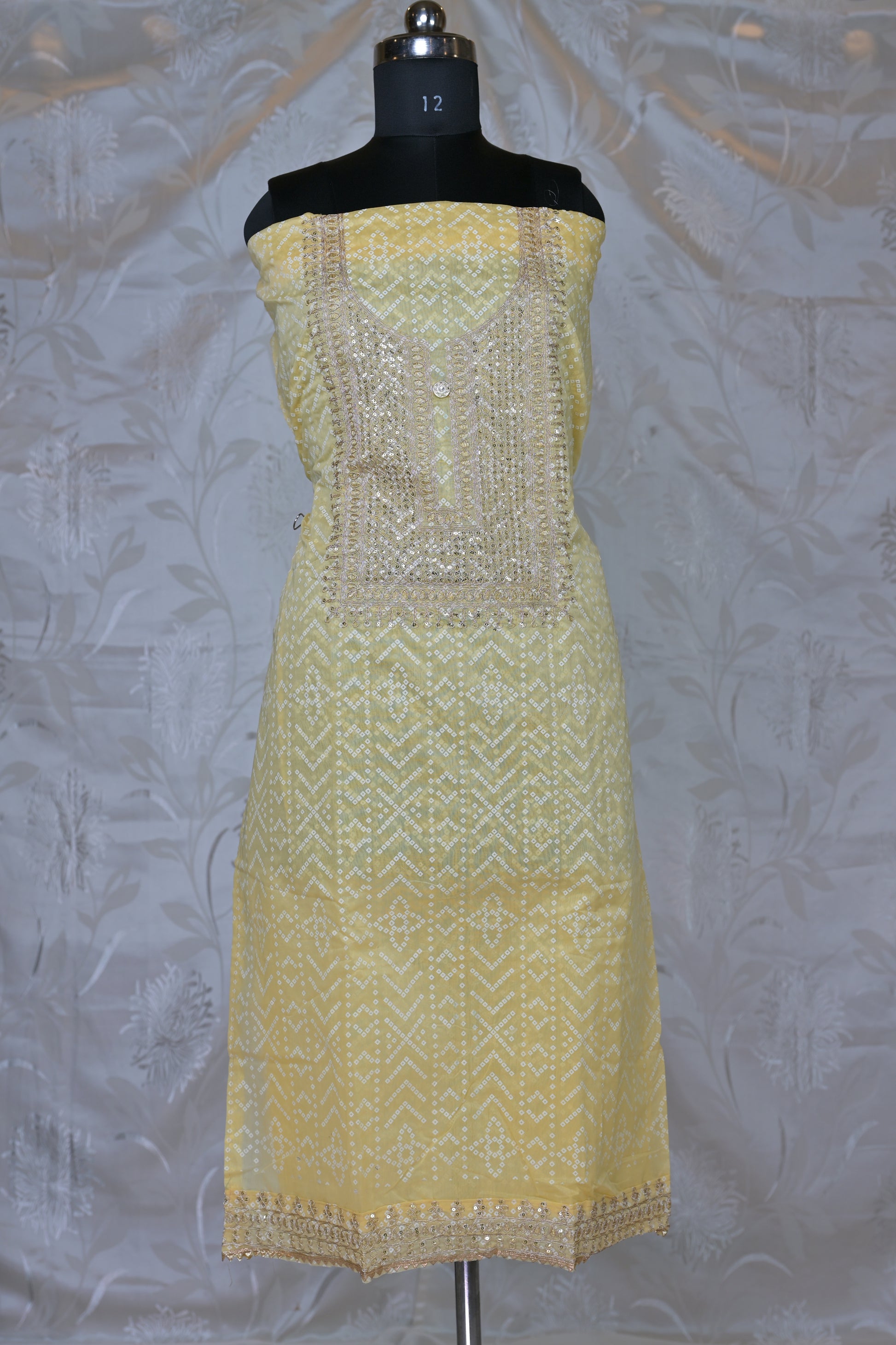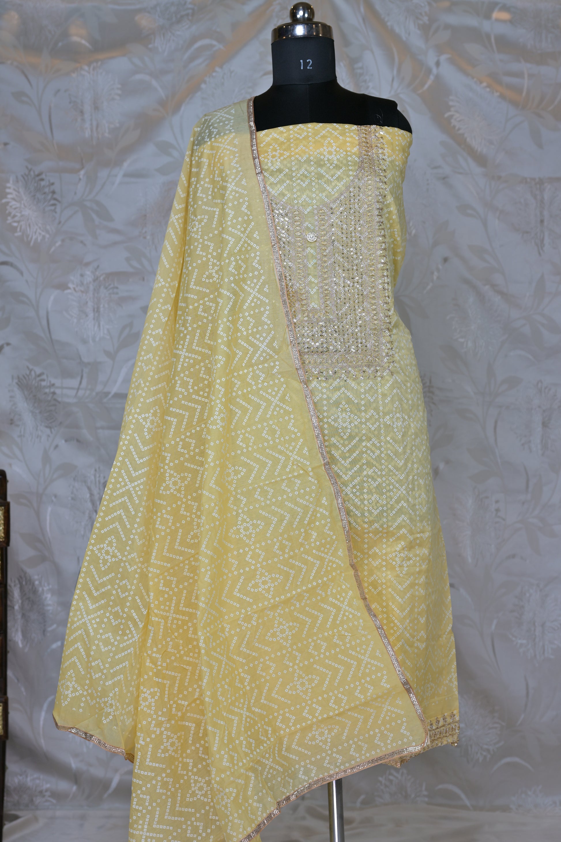Discover the perfect blend of traditional charm and contemporary style with our exquisite 3-piece unstitched suit material. Each set features a beautiful Bandhani-inspired print combined with intricate embroidery, offering a sophisticated look for any occasion.