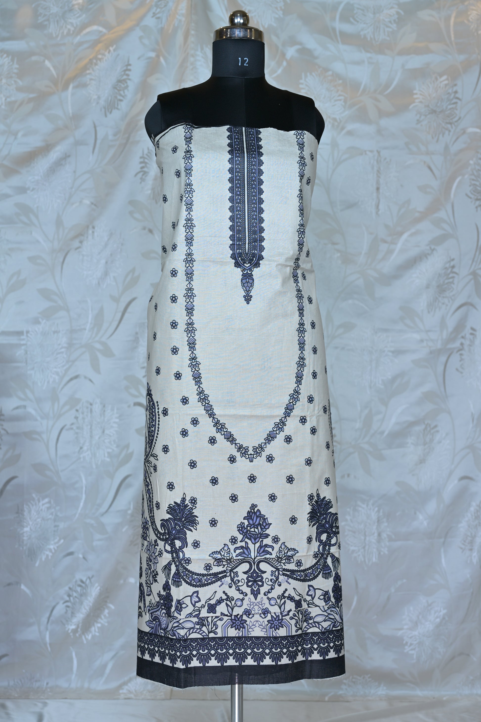 Make a sophisticated statement with our exquisite unstitched three-piece suit set, a perfect blend of classic elegance and contemporary flair. Crafted from a comfortable and breathable fabric, likely a premium lawn cotton or similar blend, the shirt piece features a subtle off-white base adorned with intricate black and deep indigo prints. These designs include delicate floral chains, traditional motifs, and elegant borders, creating a timeless and refined look.