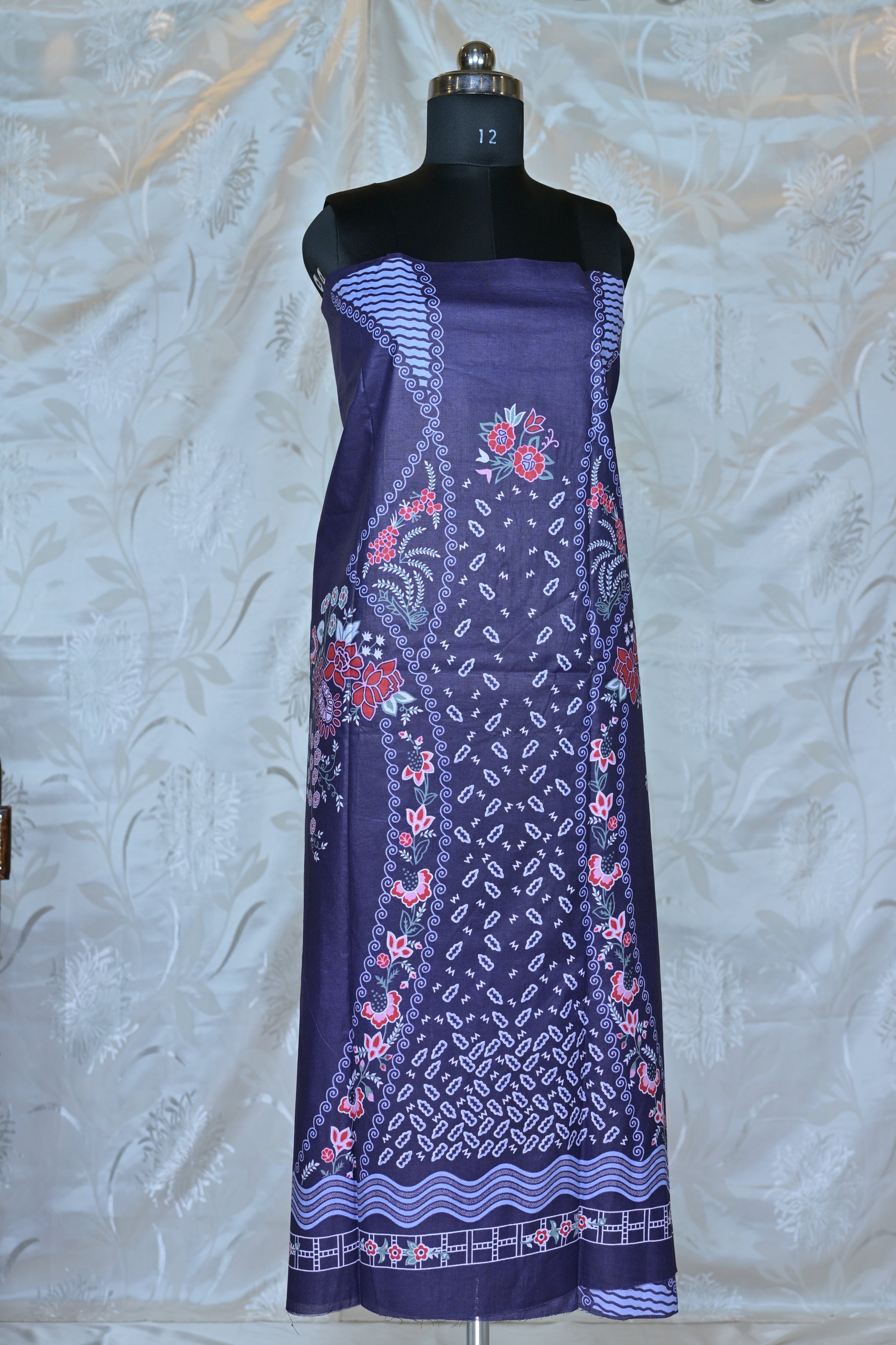Immerse yourself in subtle sophistication with our charming unstitched three-piece suit set. Crafted from a comfortable and breathable fabric, likely a premium lawn cotton or a similar blend, this set features a beautiful primary shade that oscillates between periwinkle and a soft plum, creating a unique and appealing base.