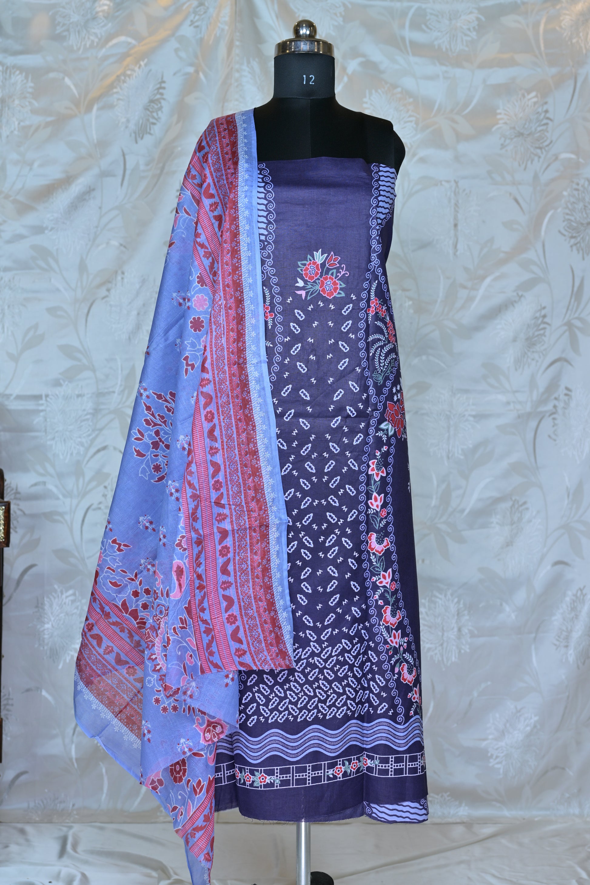 The shirt piece is adorned with delicate floral motifs in shades of pink and red, interspersed with intricate small geometric patterns and abstract designs, giving it a refined look. The design includes a decorated neckline and a patterned border at the hem, adding to its allure. The accompanying dupatta complements the shirt with its coordinating prints, featuring a mix of traditional patterns and small abstract elements in matching shades of periwinkle, plum, and red, providing a graceful drape. The set also includes a coordinating bottom fabric to complete your customized ensemble.