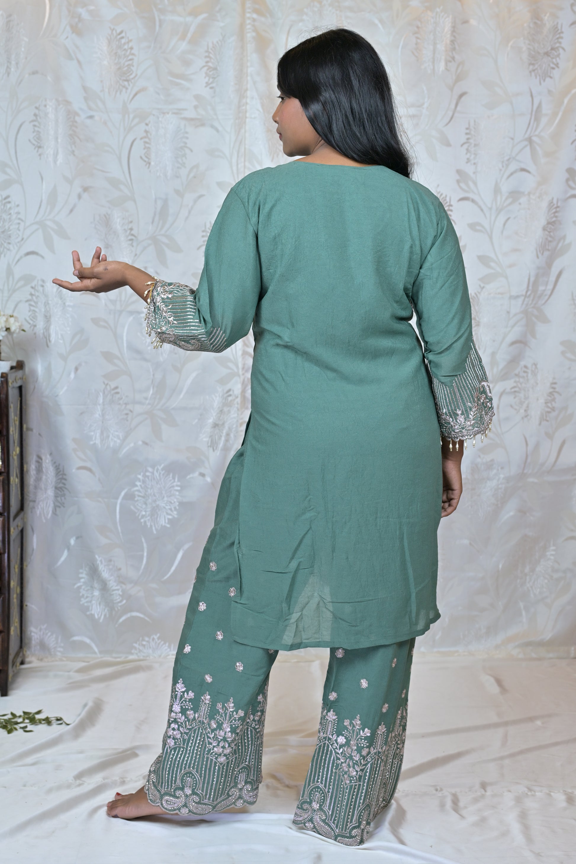 The set includes matching wide-legged palazzo pants, also embellished with coordinating silver embroidery along the hem, complementing the kurta's design.