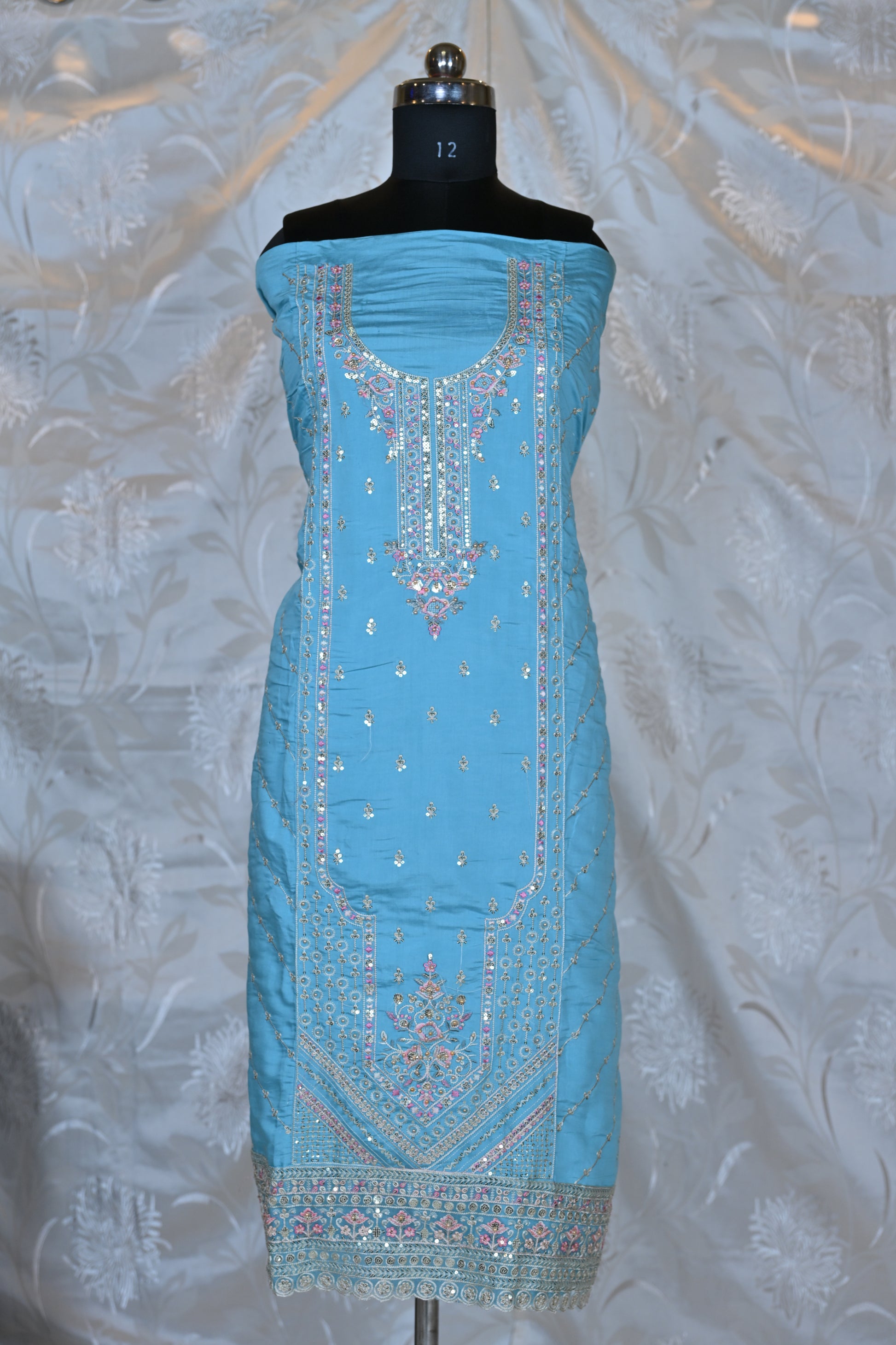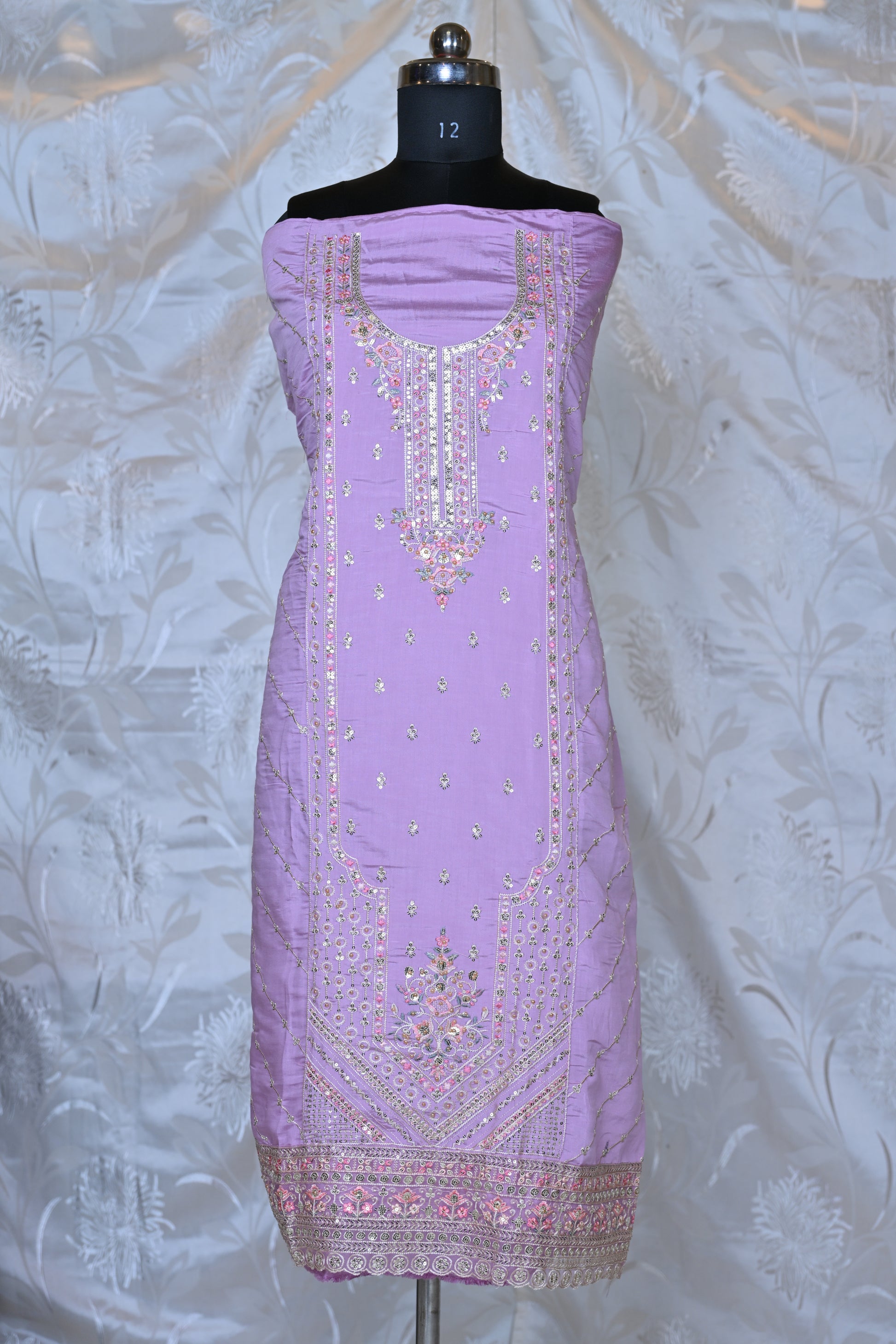 Grace any occasion with our stunning unstitched suit set, crafted from premium Chanderi Silk, known for its elegant sheen and graceful drape. This ensemble blends traditional artistry with contemporary charm, making it perfect for festive gatherings, formal events, and special celebrations.