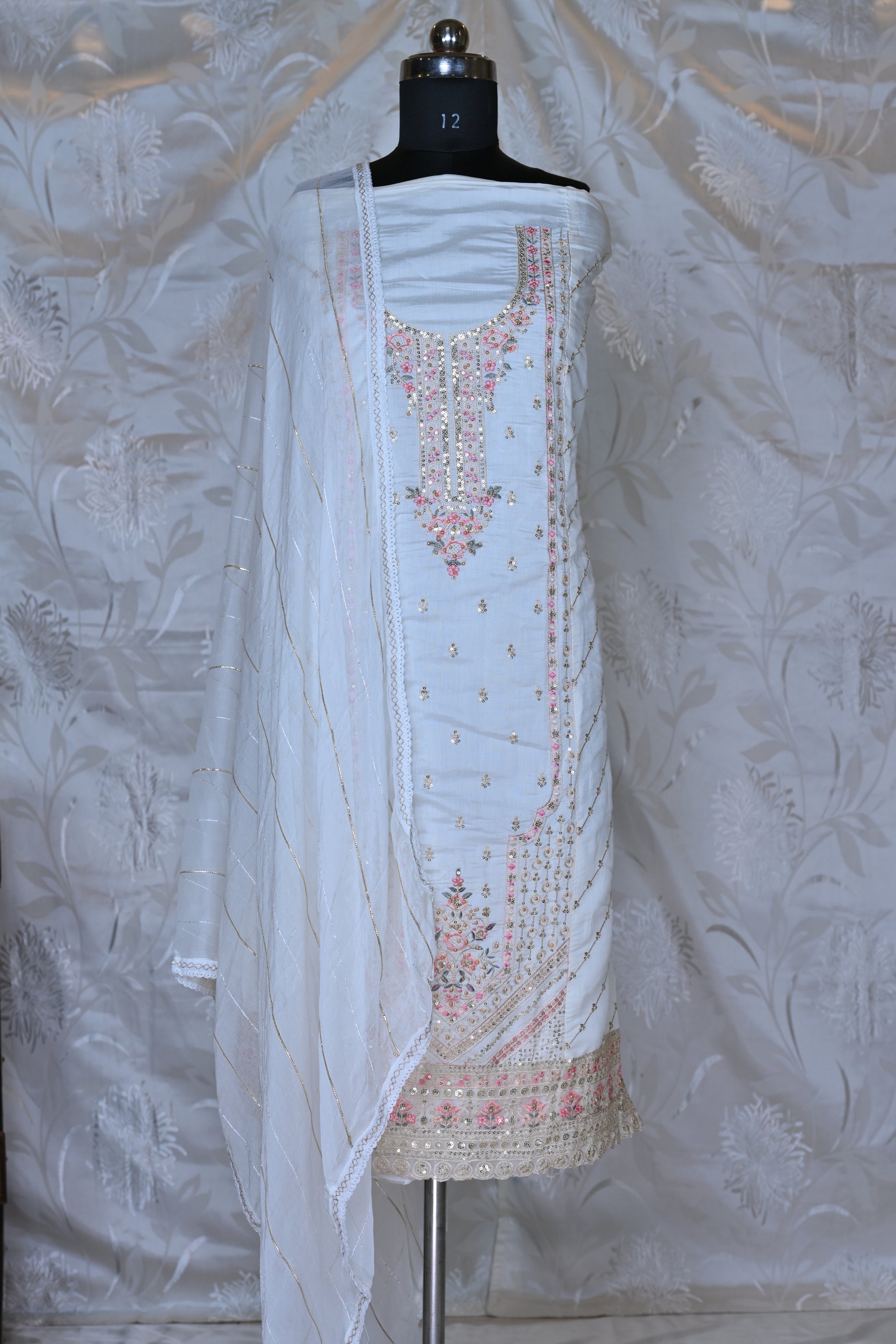 Material: Chanderi Silk (for Kurta and Dupatta, unless specified otherwise for bottom) Embellishment: Intricate Hand Embroidery with Silver and Pink Accents on Yoke, Scattered Motifs, and Embellished Hemline Border. Set Includes: Unstitched Kurta Fabric, Matching Dupatta (Bottom fabric not explicitly visible in image, but typically included in a suit set. Adjust if only top and dupatta are provided.)