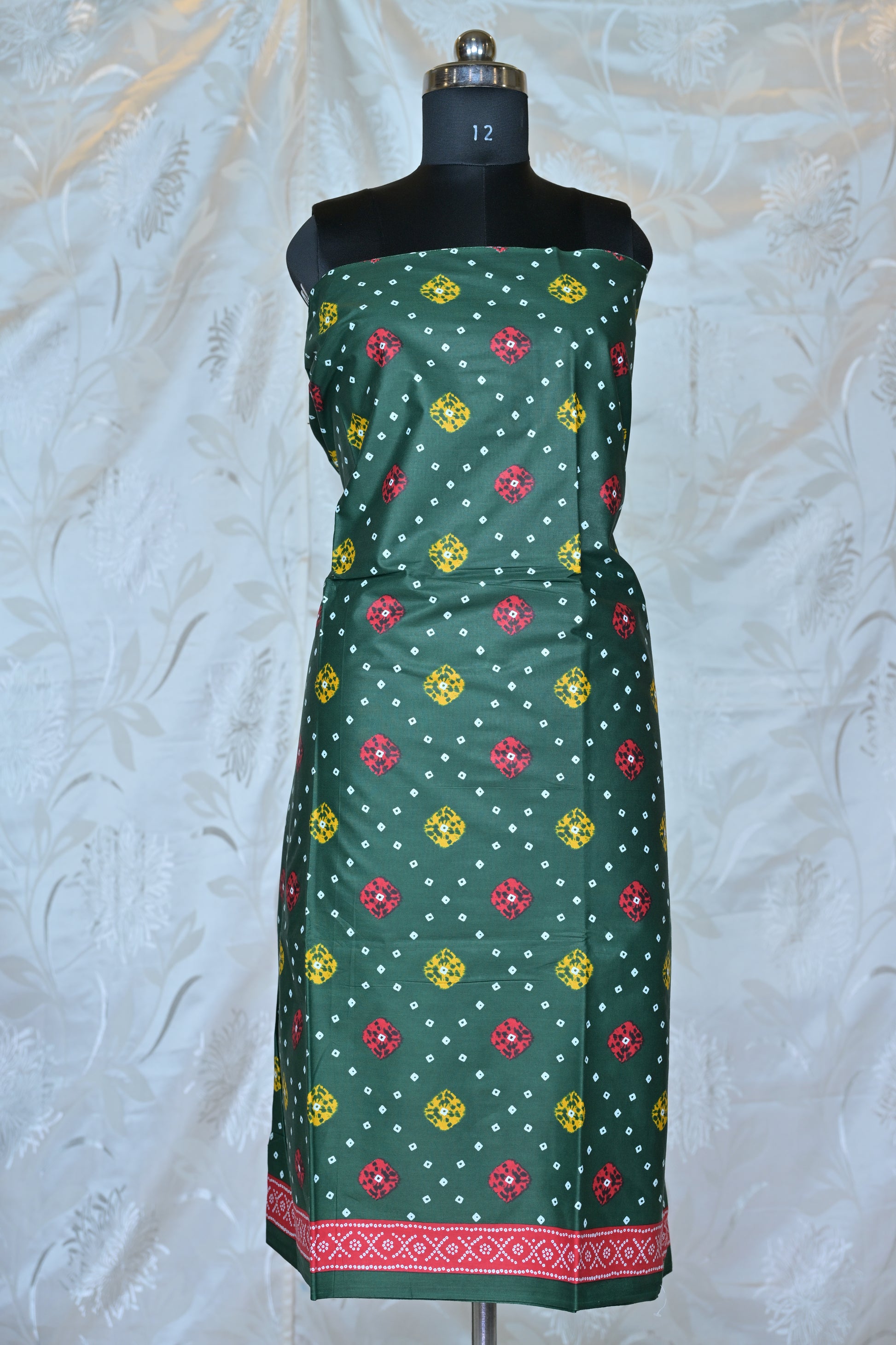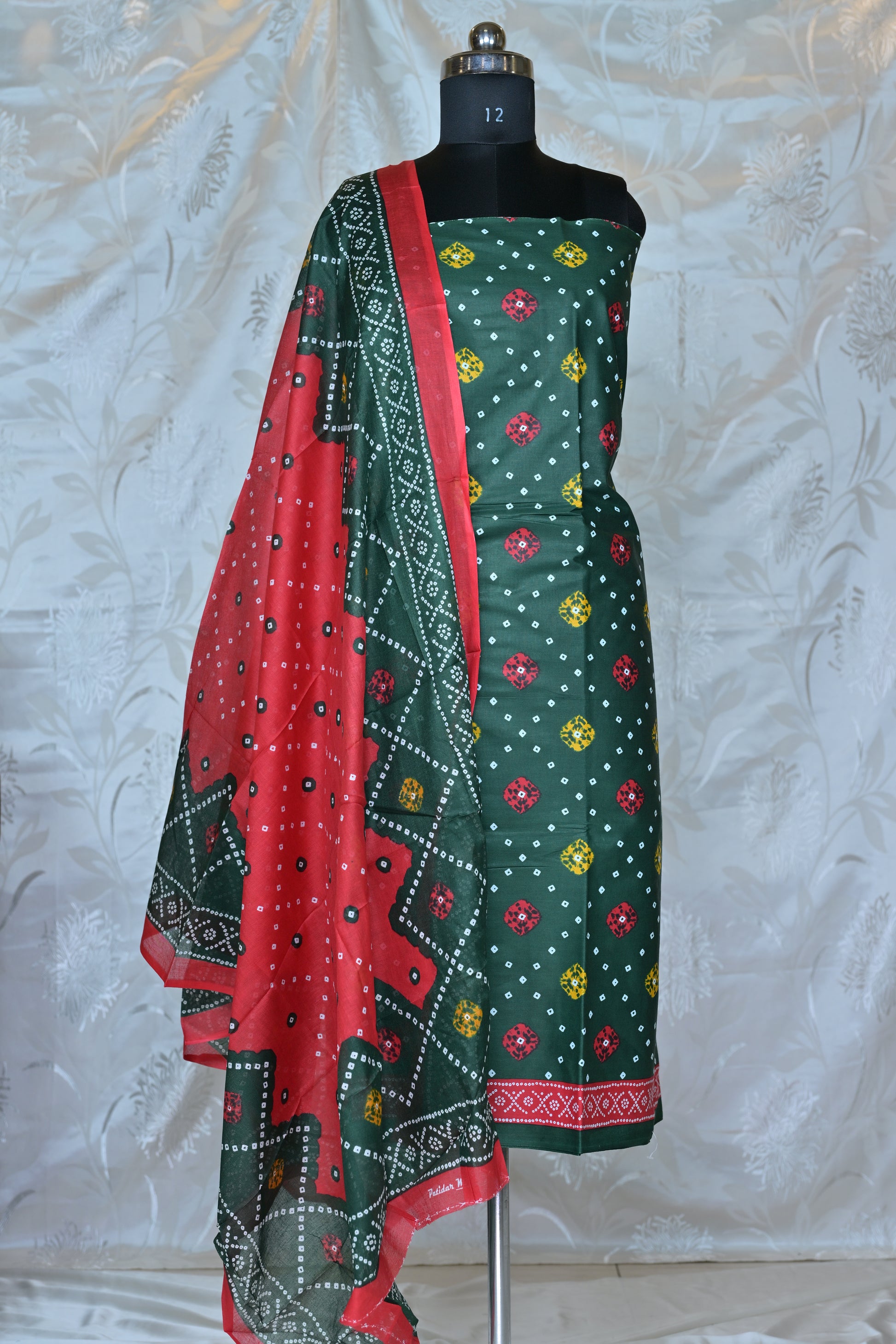 Festive Deep Green & Red Bandhani Printed Unstitched Suit Set