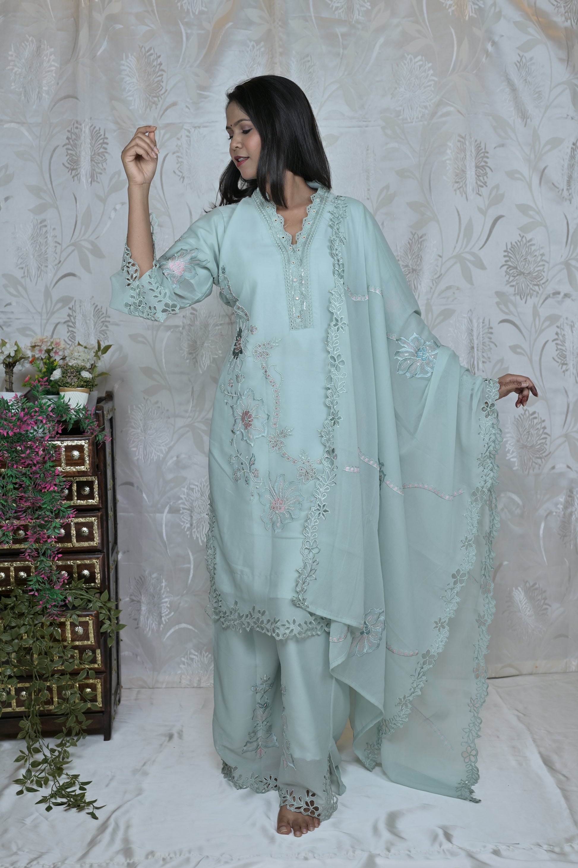 Completing the ensemble is a matching dupatta, likely in a lightweight fabric such as chiffon or georgette. The dupatta features a delicate border that coordinates with the embroidery on the kurta, adding a finishing touch of sophistication.