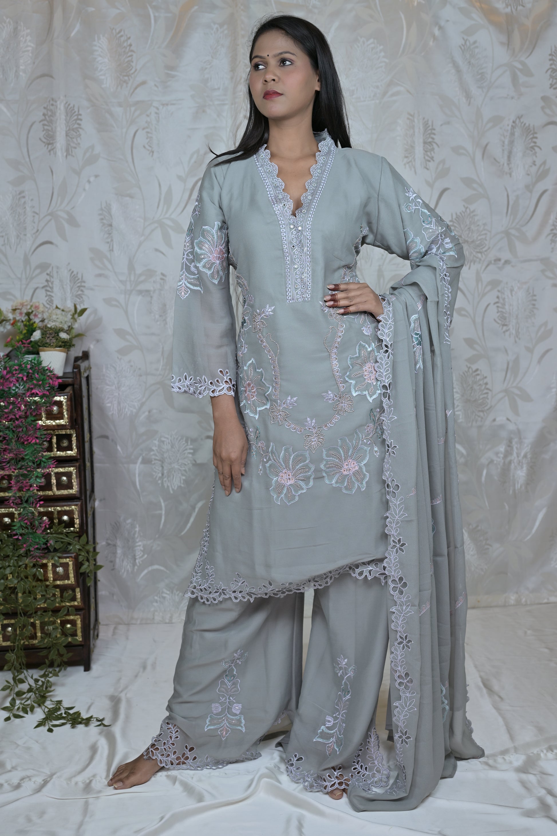 This elegant three-piece suit set is crafted from a soft, flowing fabric, likely georgette or chiffon, giving it a graceful drape. The kurta features a V-neckline and intricate embroidery with delicate floral patterns, possibly with shimmering sequin or zari detailing that catches the light. The long, bell sleeves add a touch of drama and elegance. The color is a soft, muted grey.