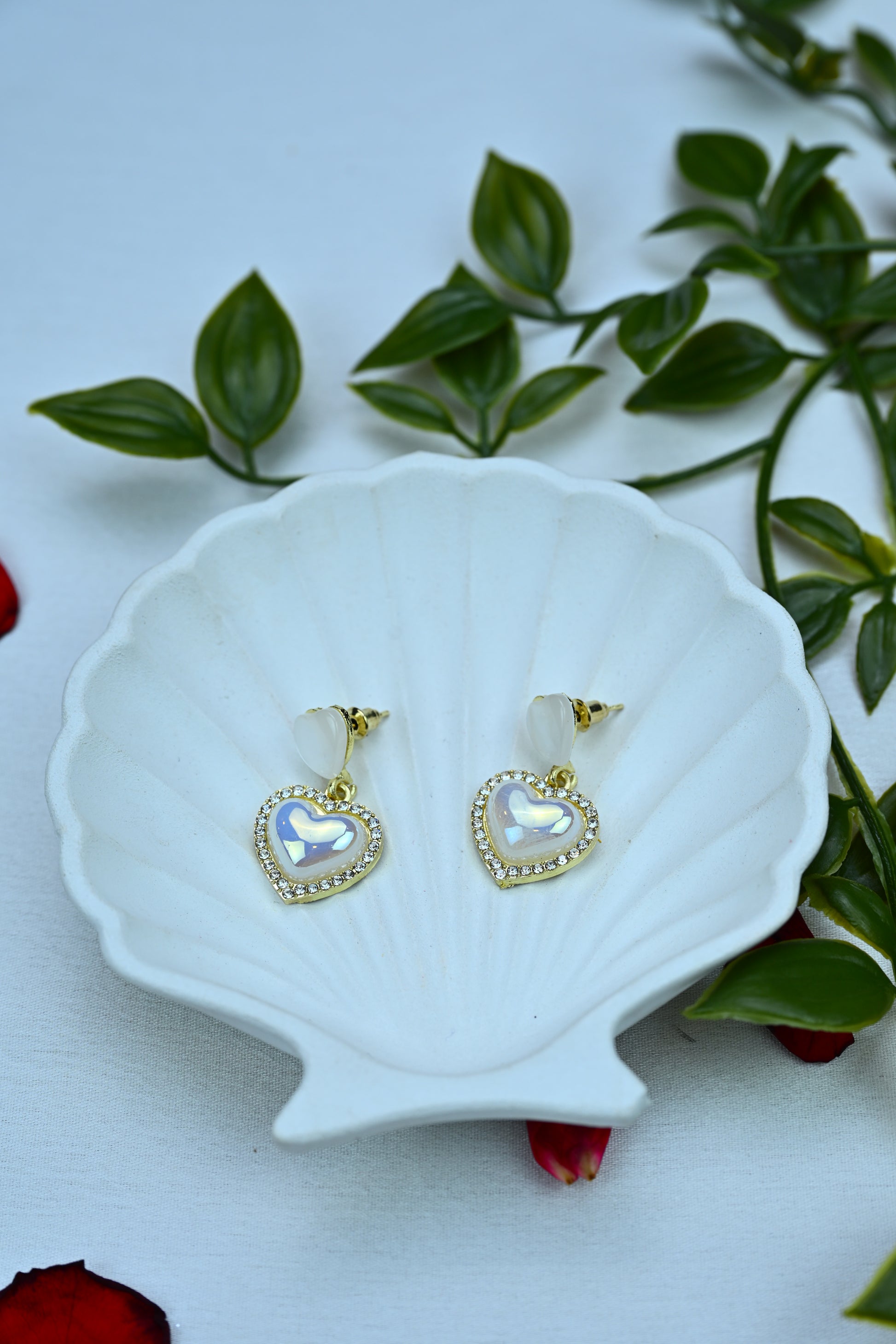 Add a touch of romance and shimmer to your look with our Iridescent Heart Drop Earrings. These charming earrings feature a delicate heart-shaped drop adorned with a lustrous, iridescent center that catches the light beautifully. Framed with a sparkling halo of miniature rhinestones and finished with a soft pearl-like stud, they strike the perfect balance between elegance and playfulness.