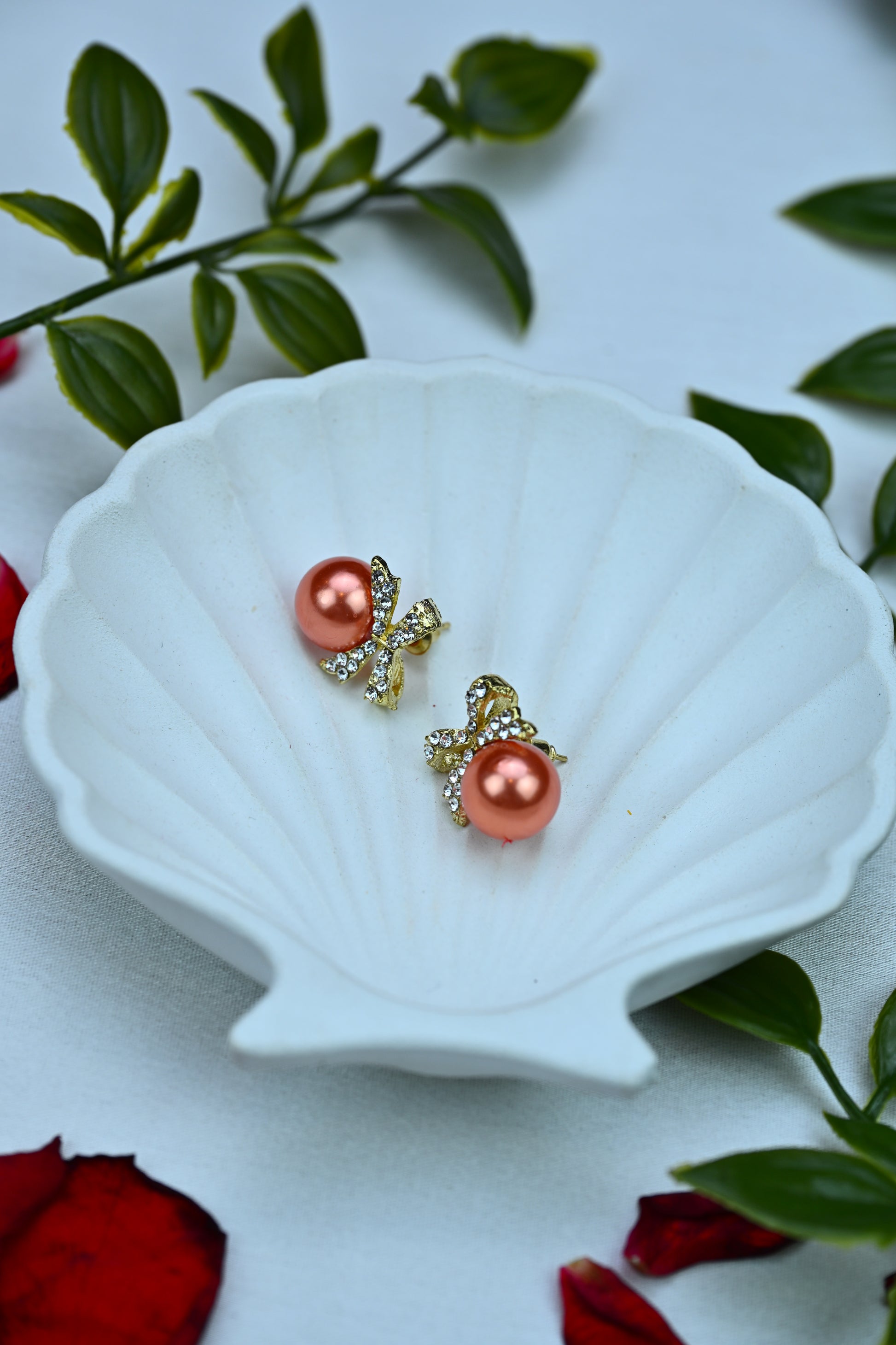 Chic and charming, these Korean-style earrings feature a glossy peach pearl accented with a sparkling crystal-studded gold bow. Lightweight and elegant, perfect for daily wear or a subtle glam touch to evening looks. Push-back closure for a secure fit.