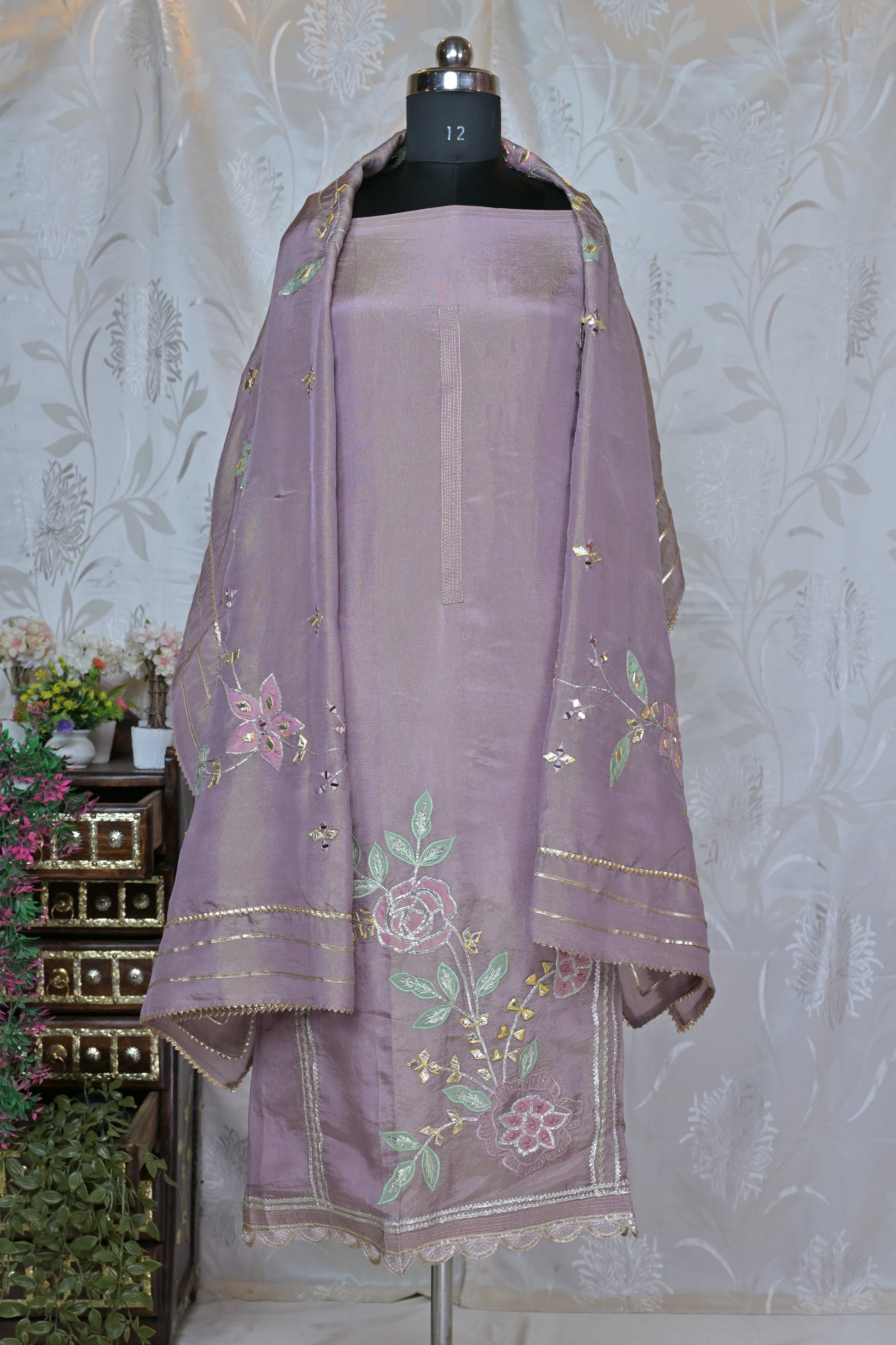 Indulge in understated luxury with our Graceful Lavender Embroidered & Gota Patti Semi-Stitched Suit Material. This exquisite three-piece ensemble allows you to create a custom-fitted outfit that exudes sophistication and traditional charm. Perfect for festive celebrations, family gatherings, or special daytime events.