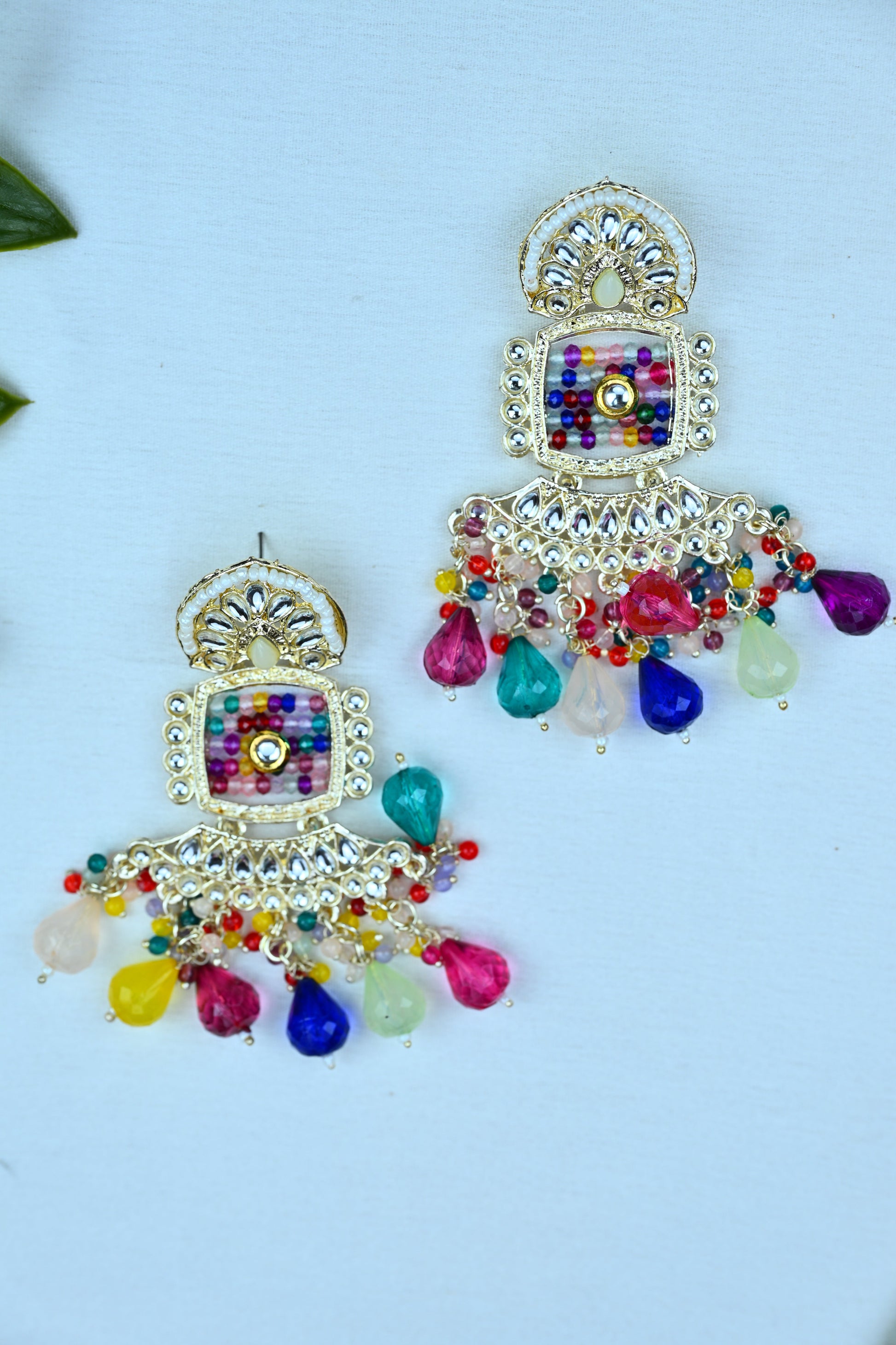 A vibrant fusion of tradition and color, these statement kundan earrings feature radiant mirror work and multicolored bead accents. Designed to dazzle at festive occasions, they bring a playful yet regal charm to your ensemble.