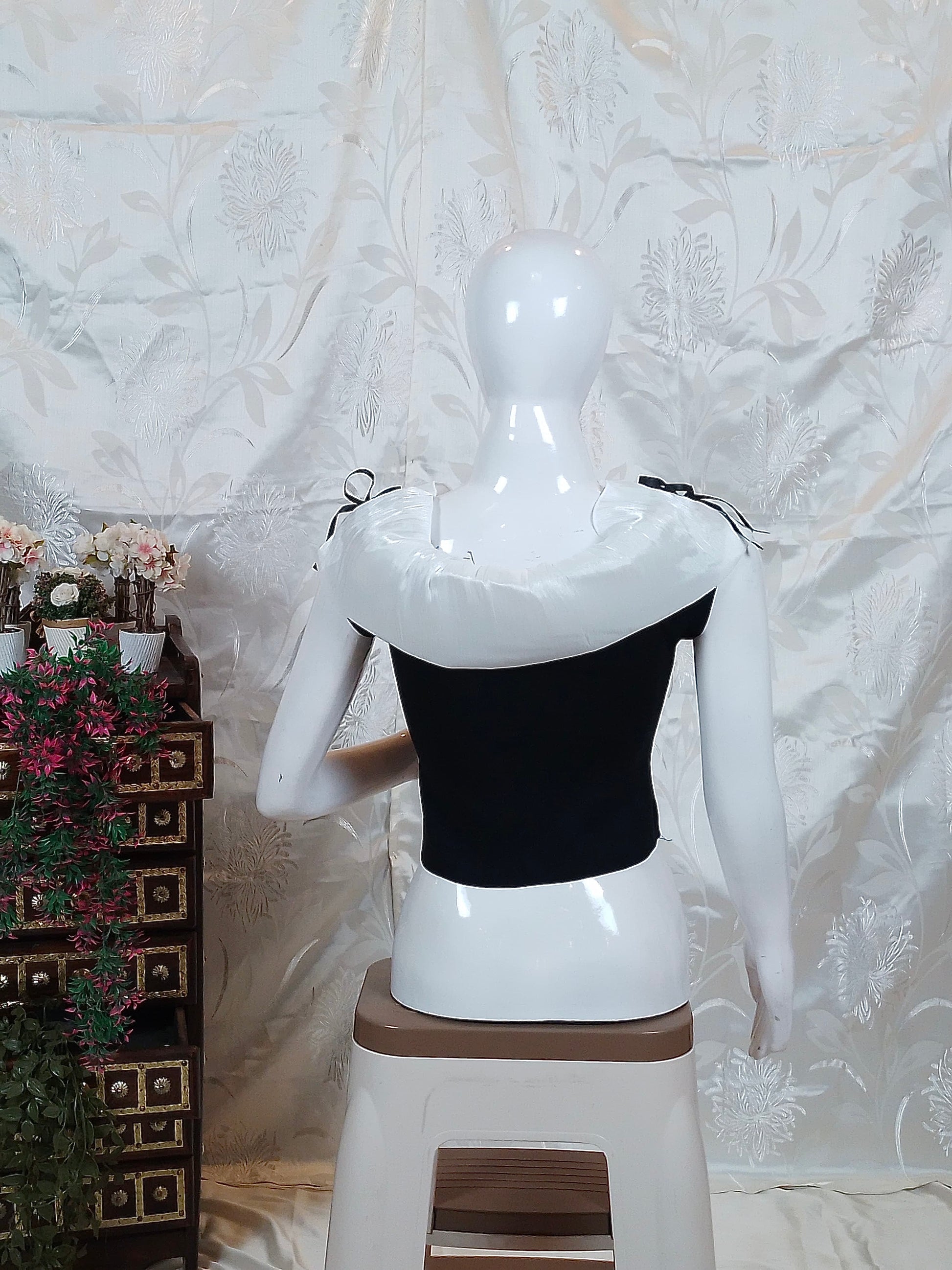 Product Details: Show off your shoulders in style with this trendy black and white print off-shoulder top. Featuring a chic off-the-shoulder neckline accentuated with delicate tie details, this top is perfect for a fashionable and alluring look.