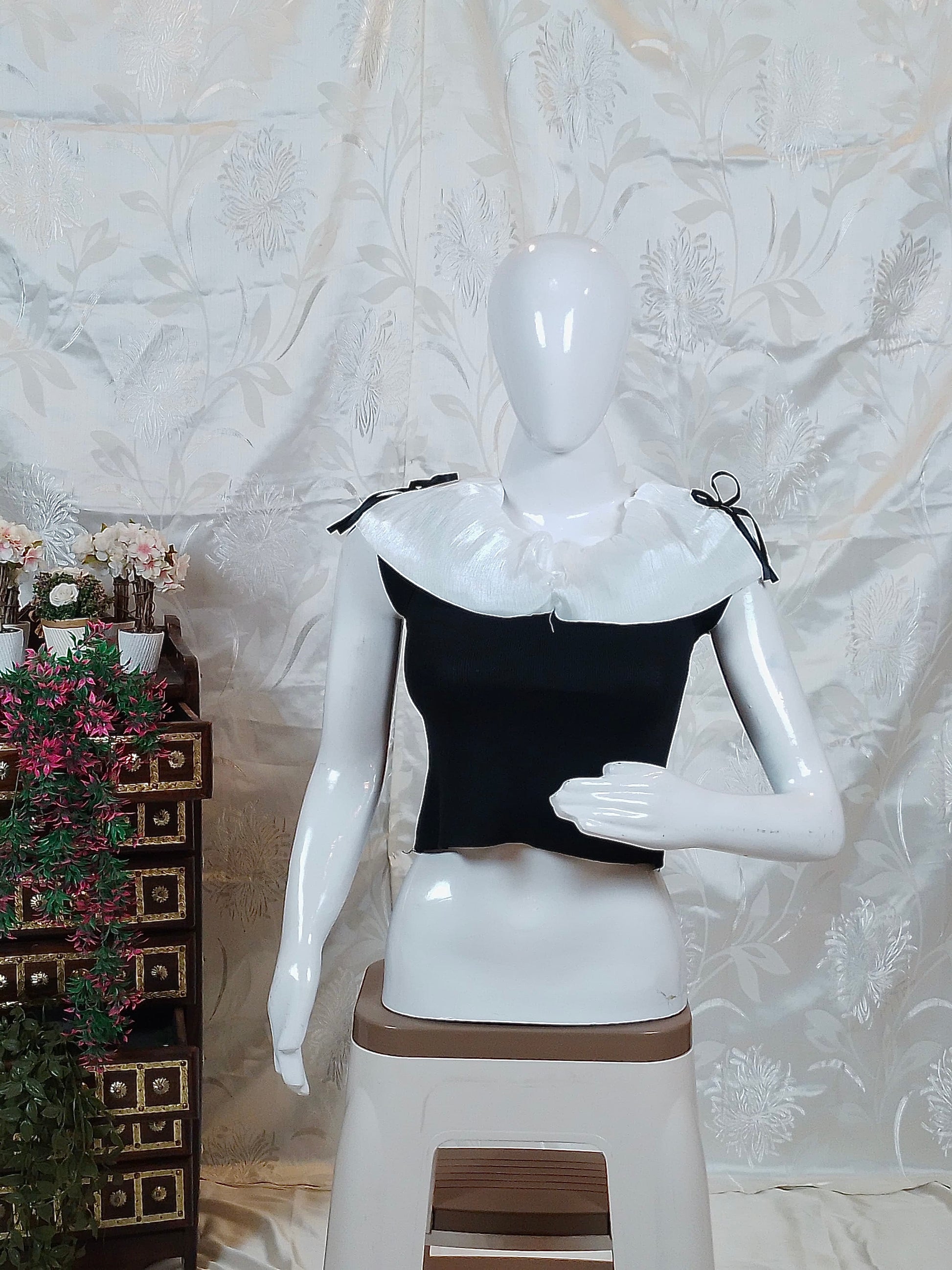 Neckline: Elasticized off-shoulder neckline with ruffle trim, featuring small tie details at the shoulders for an adjustable and stylish touch.