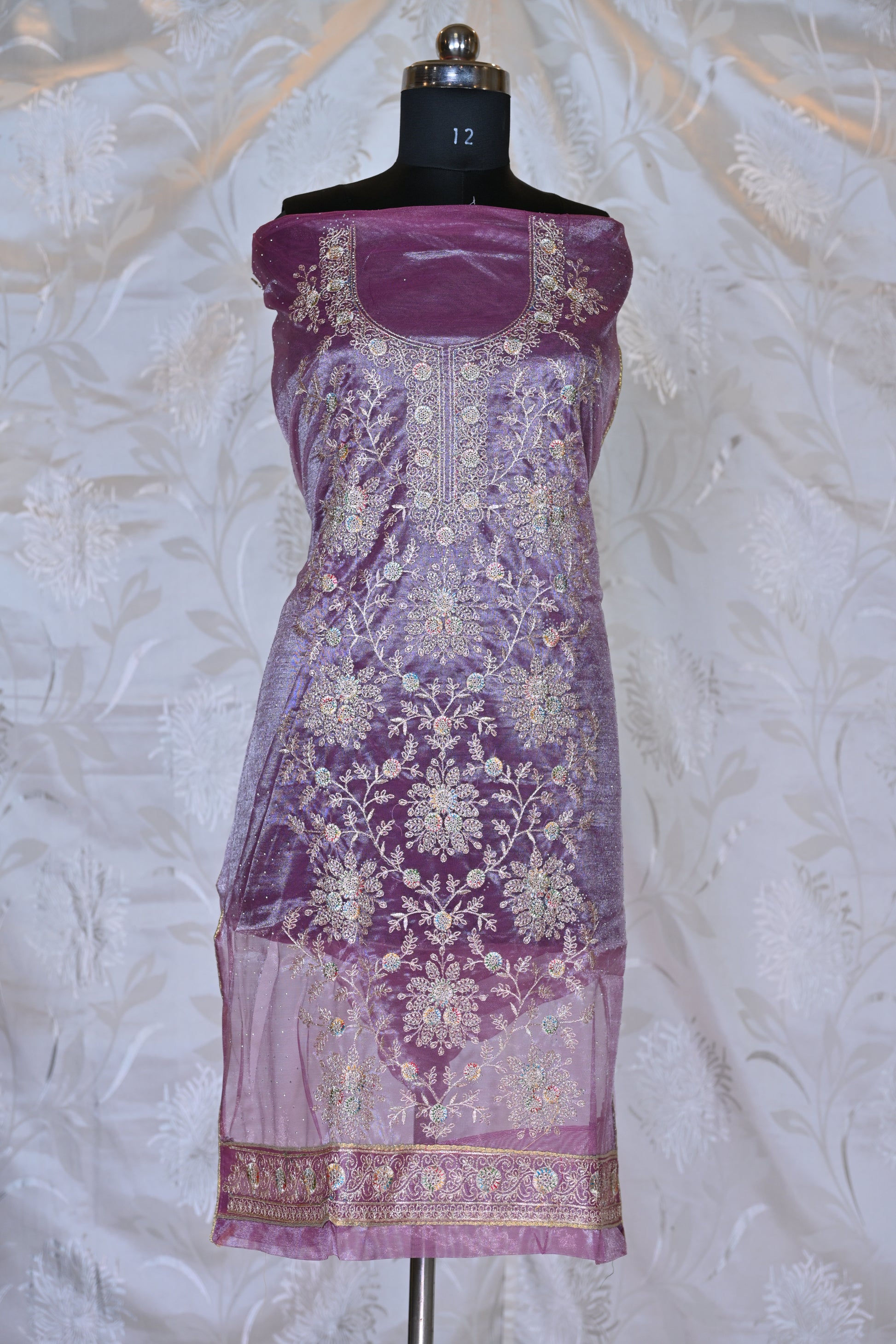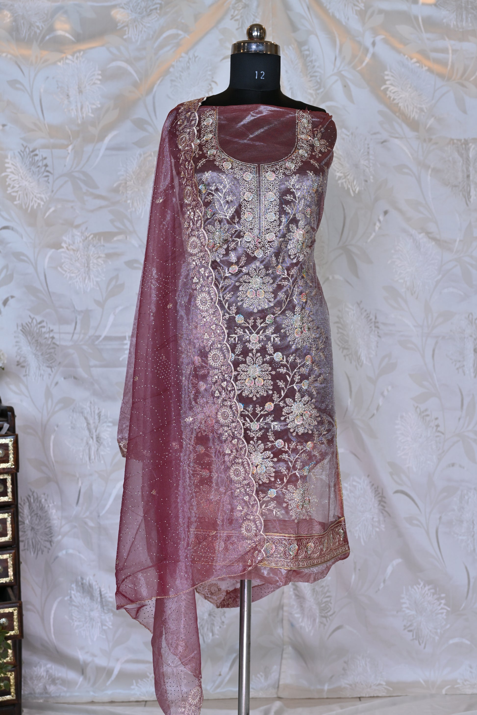 Step into sophistication with our breathtaking collection of unstitched suit sets, meticulously crafted from luxurious Organza fabric. Each piece is a testament to intricate artistry, featuring lush floral embroidery that exudes elegance and charm, perfect for weddings, festive occasions, and grand celebrations.