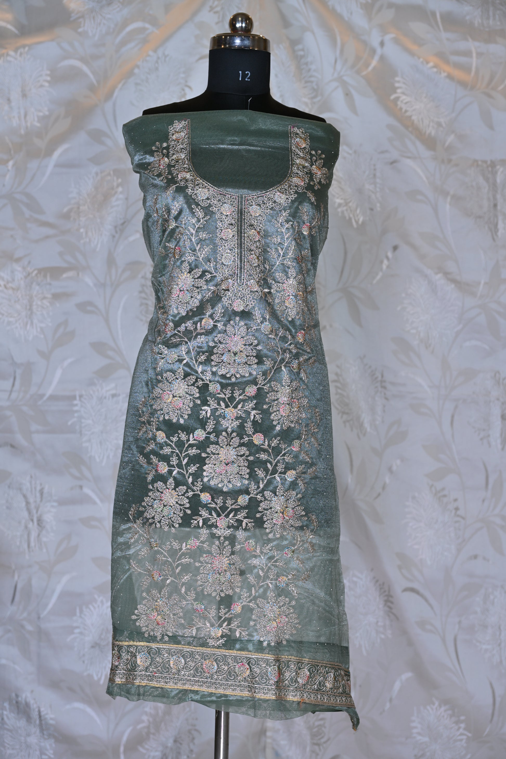 Material: Organza (for Kurta and Dupatta) Embellishment: Elaborate Thread Embroidery, Sequin Work, and possibly Beadwork throughout the kurta and on the dupatta borders, with scattered embellishments on the dupatta. Set Includes: Unstitched Kurta Fabric, Matching Embroidered Organza Dupatta (Bottom fabric not explicitly visible in images, but typically included in a suit set. Adjust if only top and dupatta are provided.)