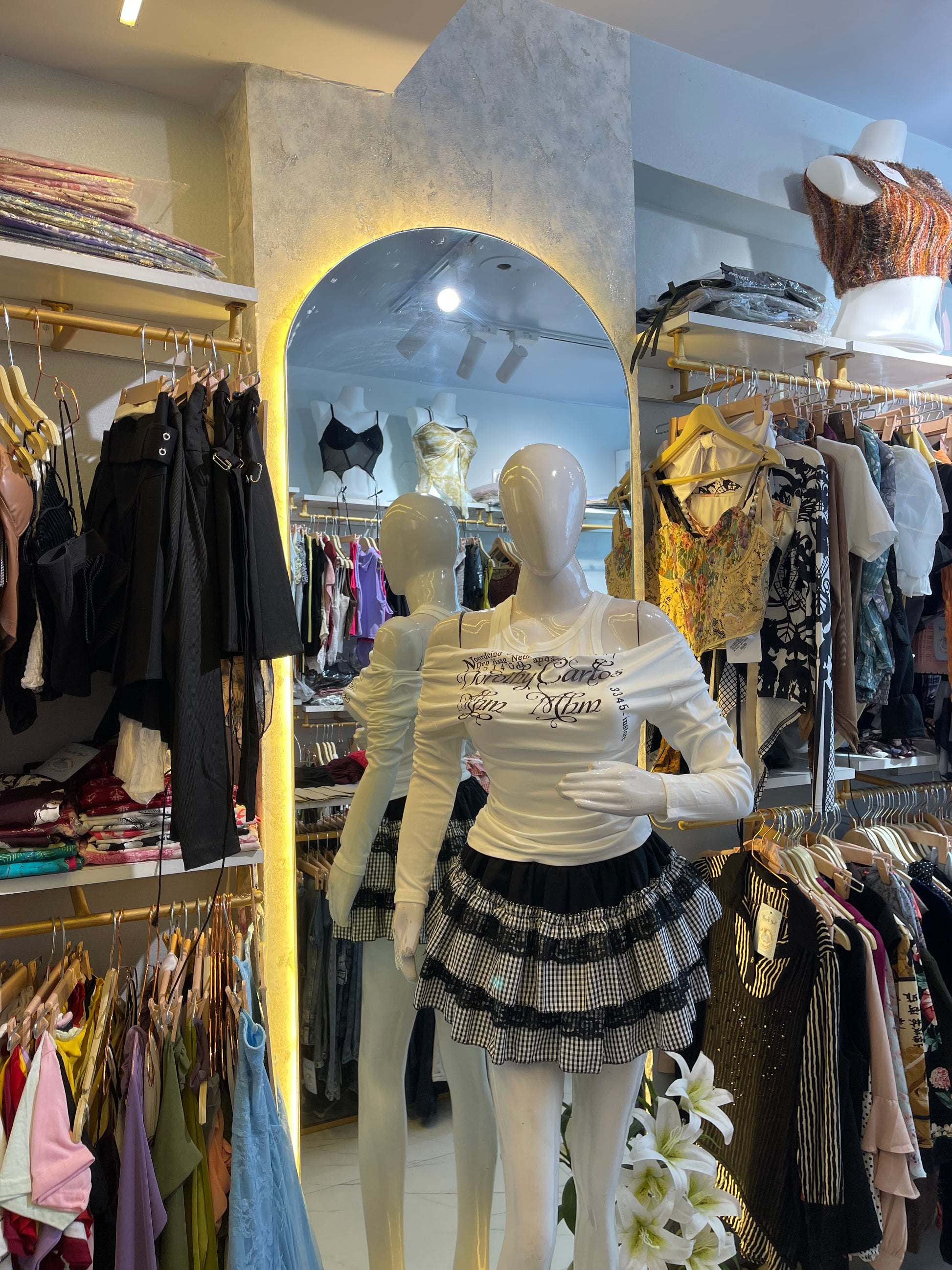 Channel playful Korean-inspired style with this adorable Two-Piece Top and Skirt Set. The top is a chic white long-sleeve knit featuring a wide, off-the-shoulder neckline and bold graphic or text print across the chest. This is perfectly paired with a tiered mini skirt featuring a trendy black and white gingham/plaid print and a solid black ruffled hem. The combination offers a youthful, fashionable look that's perfect for a casual outing, college day, or making a street-style statement.
