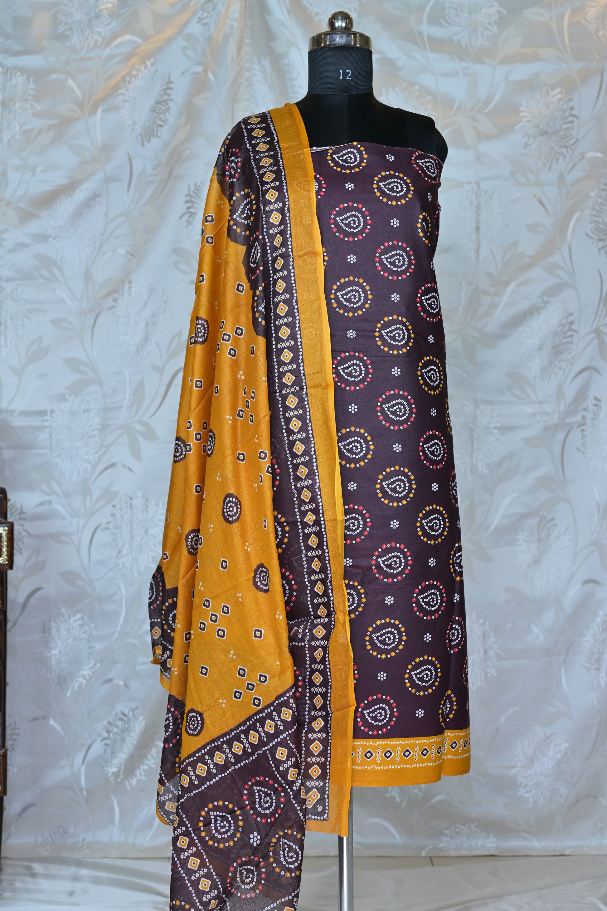 Rich Maroon & Mustard Bandhani Printed Unstitched Suit Set