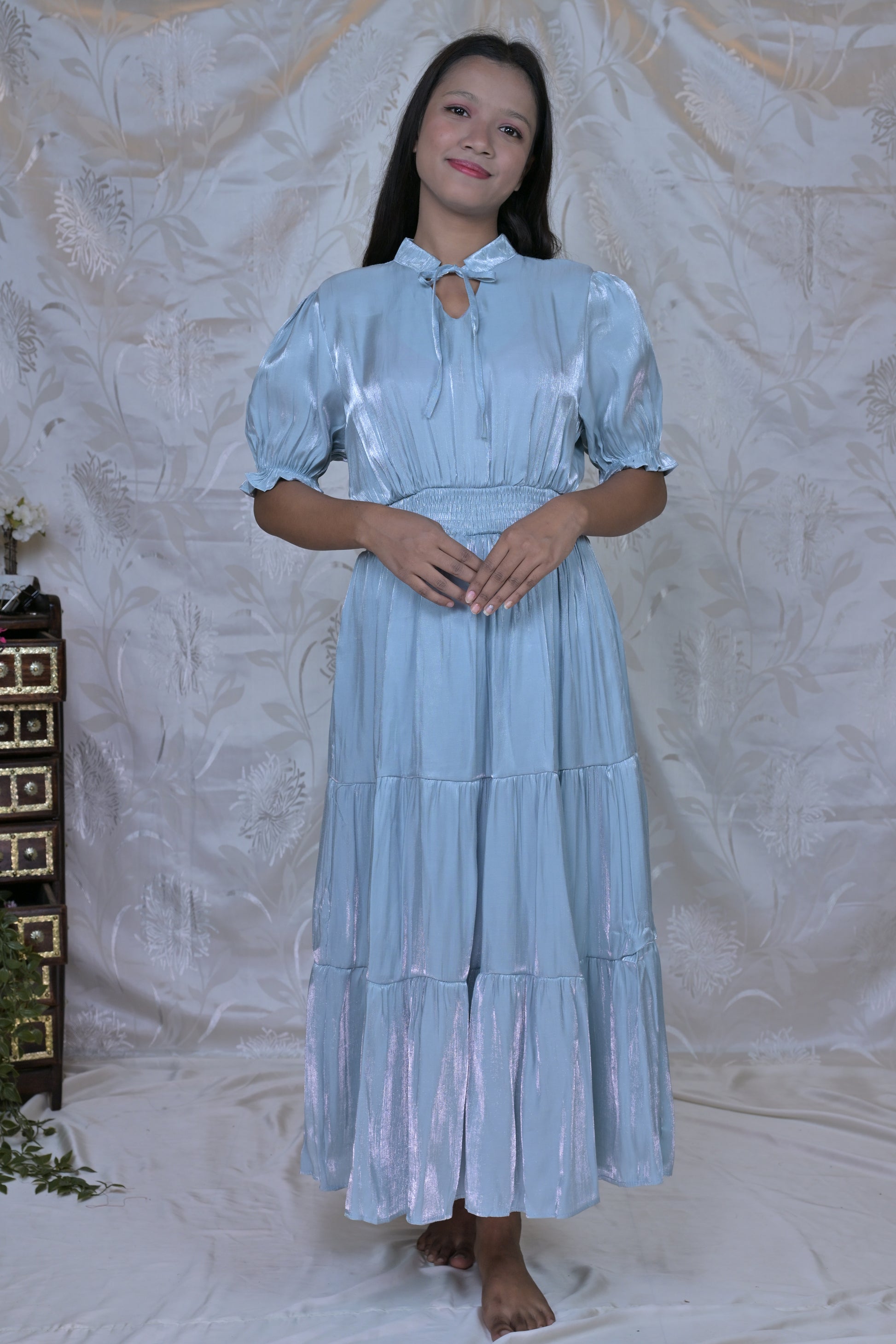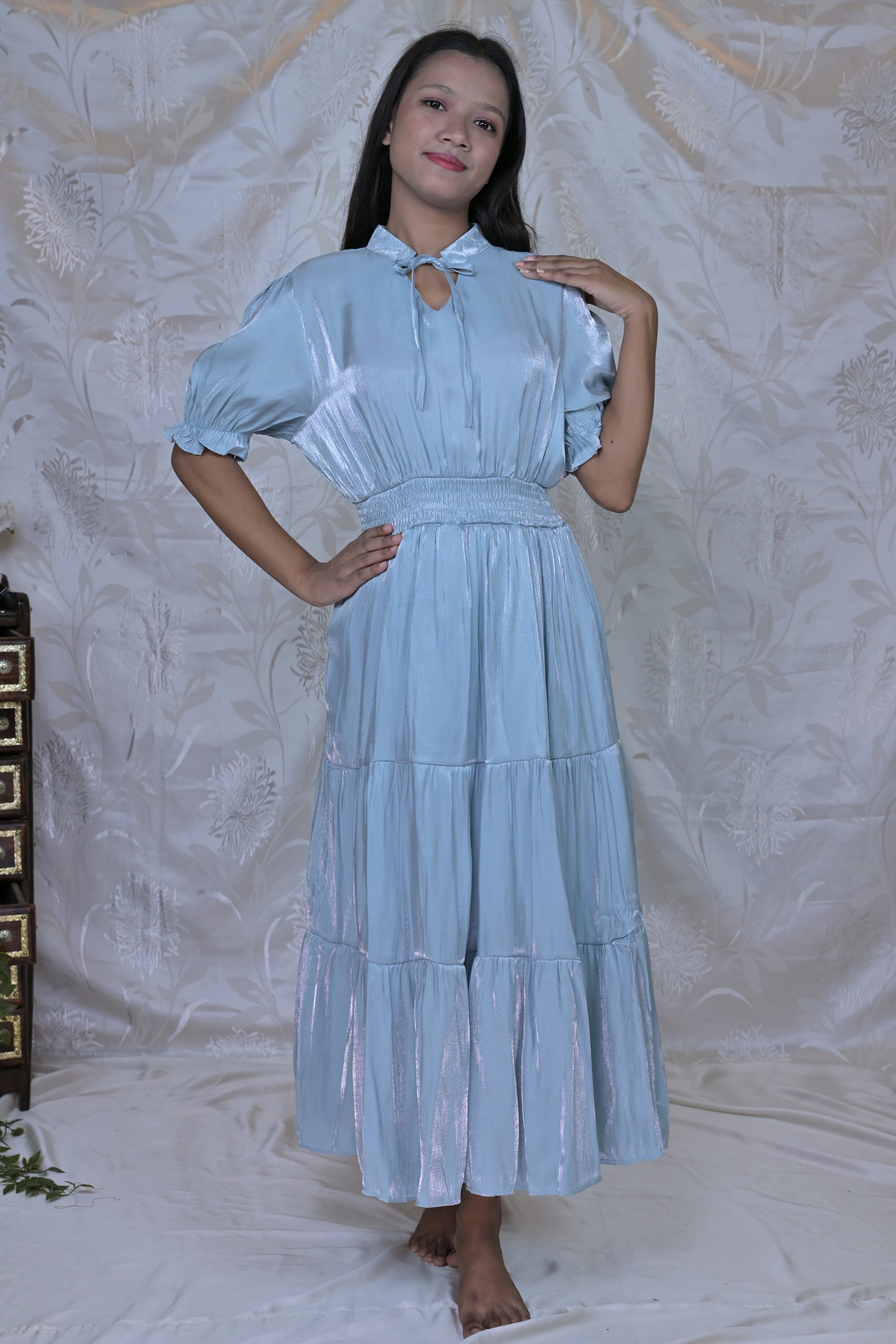 Color & Design Features: This dress features a beautiful, serene shade of light dusty blue or muted sky blue, imbued with a delicate, pearlescent shimmer that catches the light beautifully. The design is rich in sophisticated details: