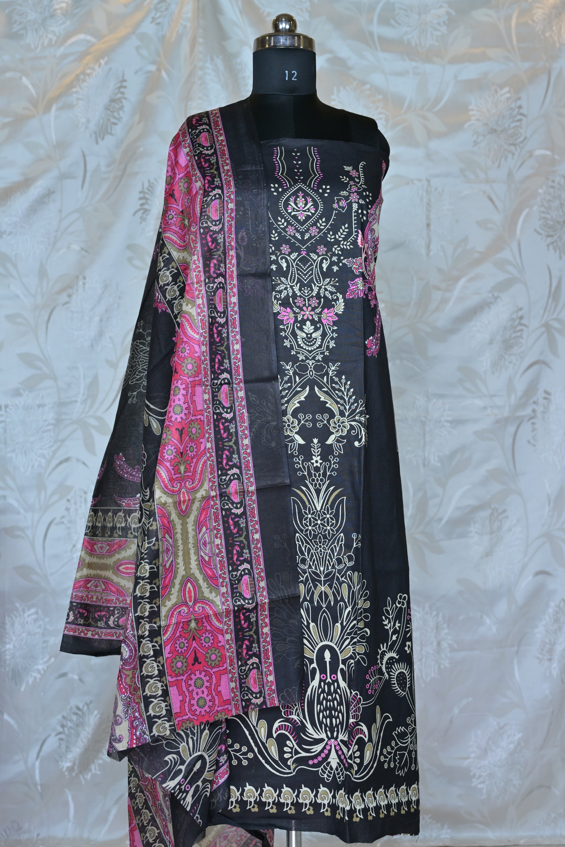 Sophisticated Black & Fuchsia Printed Unstitched Suit Set