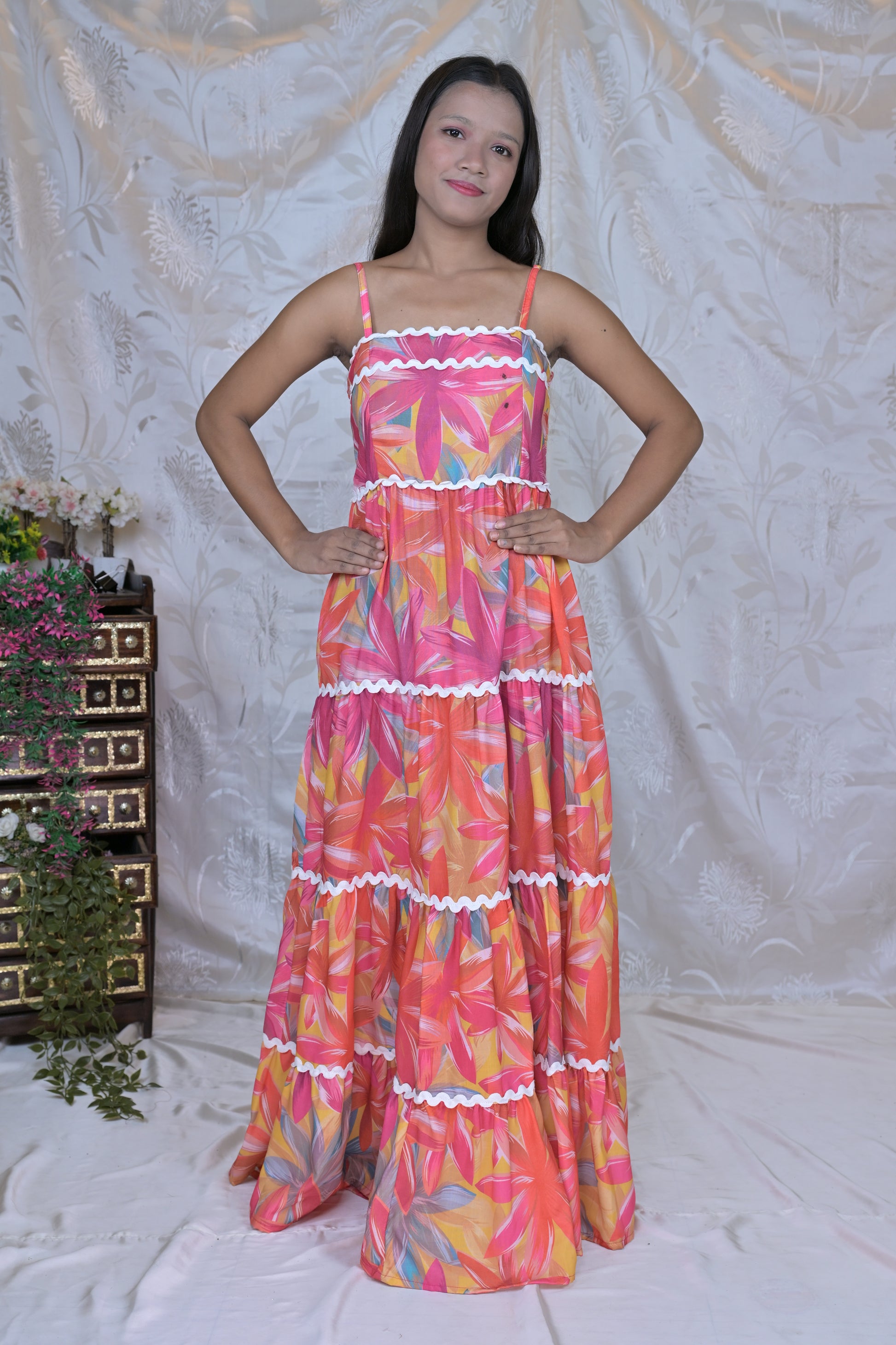 Color & Design: This dress features a captivating and lively print that evokes lush botanical scenery. The dominant colors include vibrant shades of fuchsia and coral pink, intertwined with sunny yellow, hints of sky blue, and touches of earthy green. The print showcases an artistic interpretation of large leaves or floral motifs, creating a striking and dynamic visual. The dress is designed with multiple cascading tiers, each beautifully separated by delicate white scallop-edged trim, adding a charming detail and enhancing the flow of the garment.