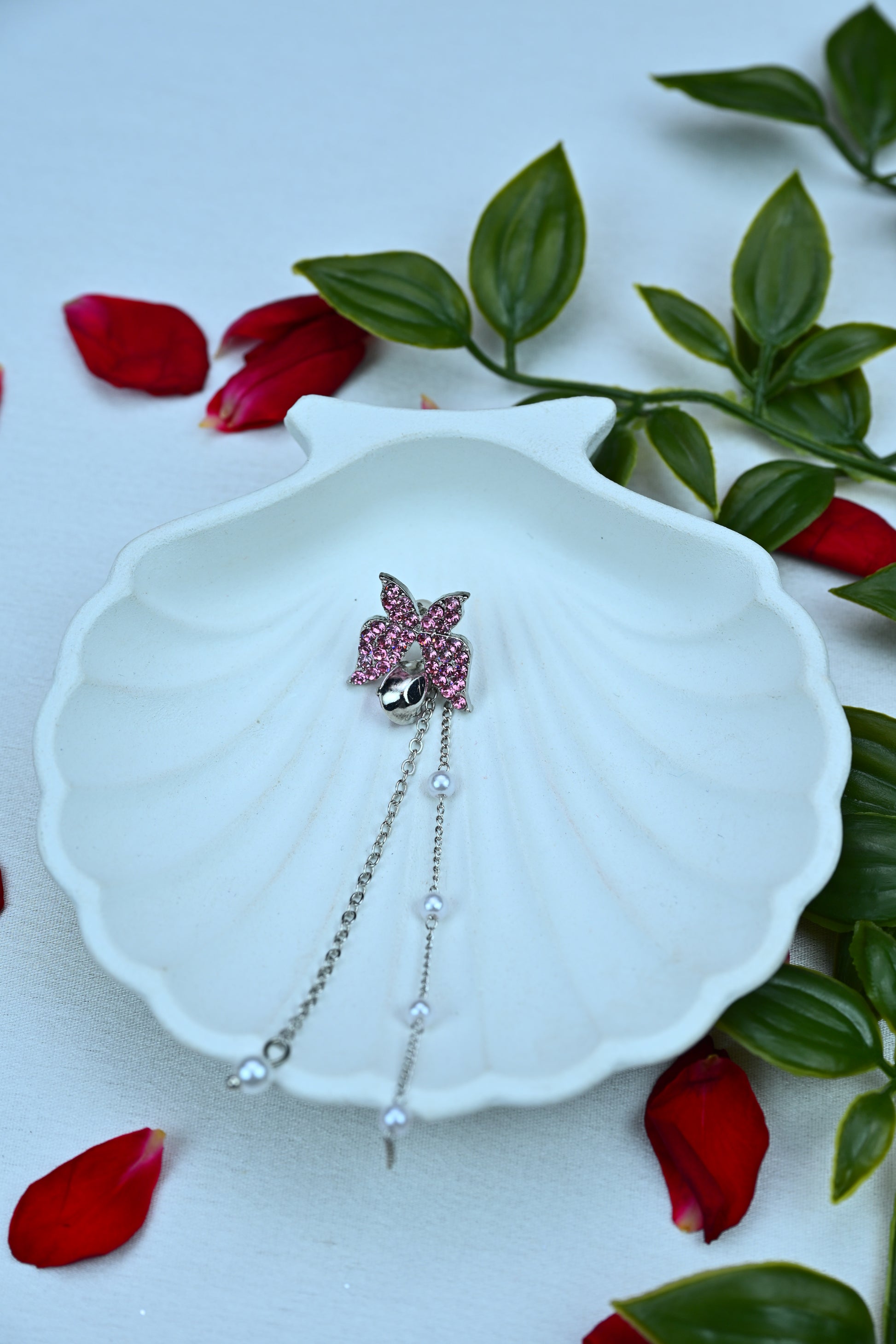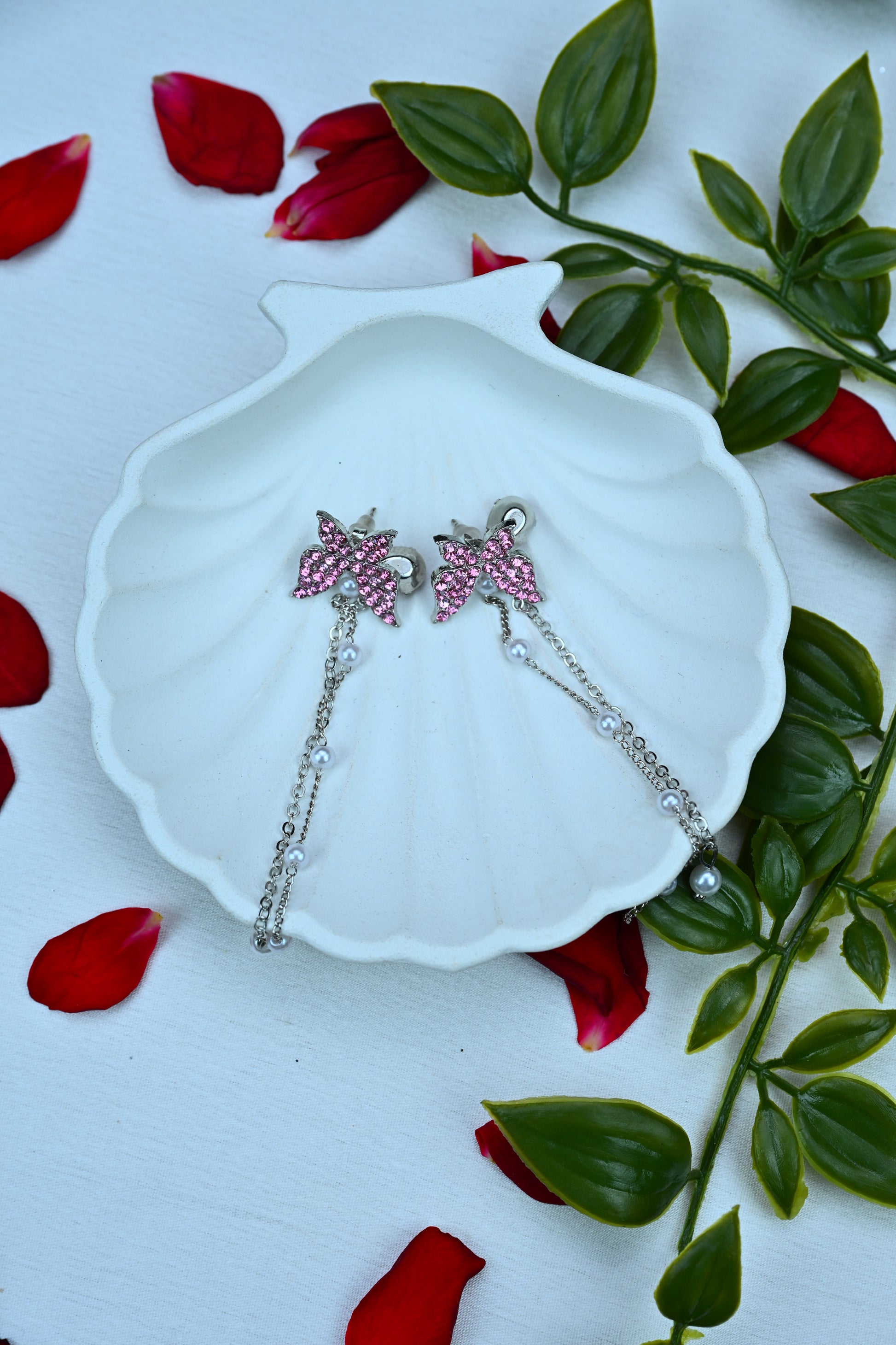 Add a flutter of glam to your look with our Twilight Butterfly Dangle Studs — a charming fusion of sparkle and grace. These earrings feature rhinestone-encrusted pink butterflies perched on the ear, trailing twin silver chains accented with delicate pearls for an elegant drape.