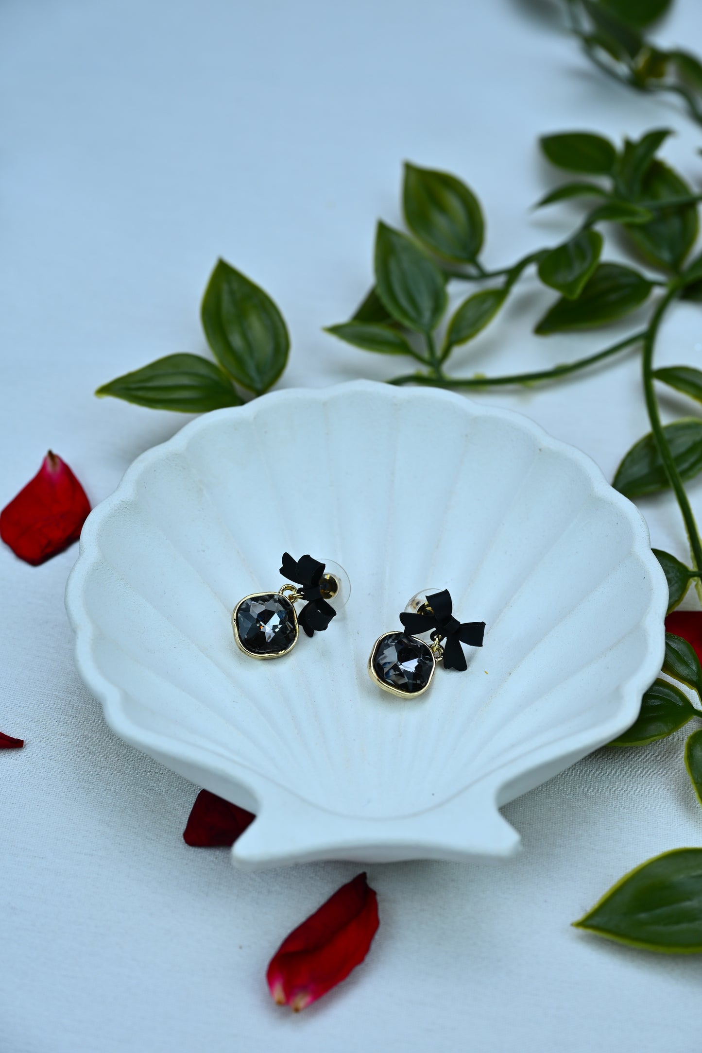 Sweet meets sophisticated in our Velvet Noir studs. Featuring a luxe black crystal encased in a golden bezel and topped with a dainty matte black bow, these earrings are the perfect blend of elegance and playful charm. Think Parisian night outs or a touch of drama for your everyday look.