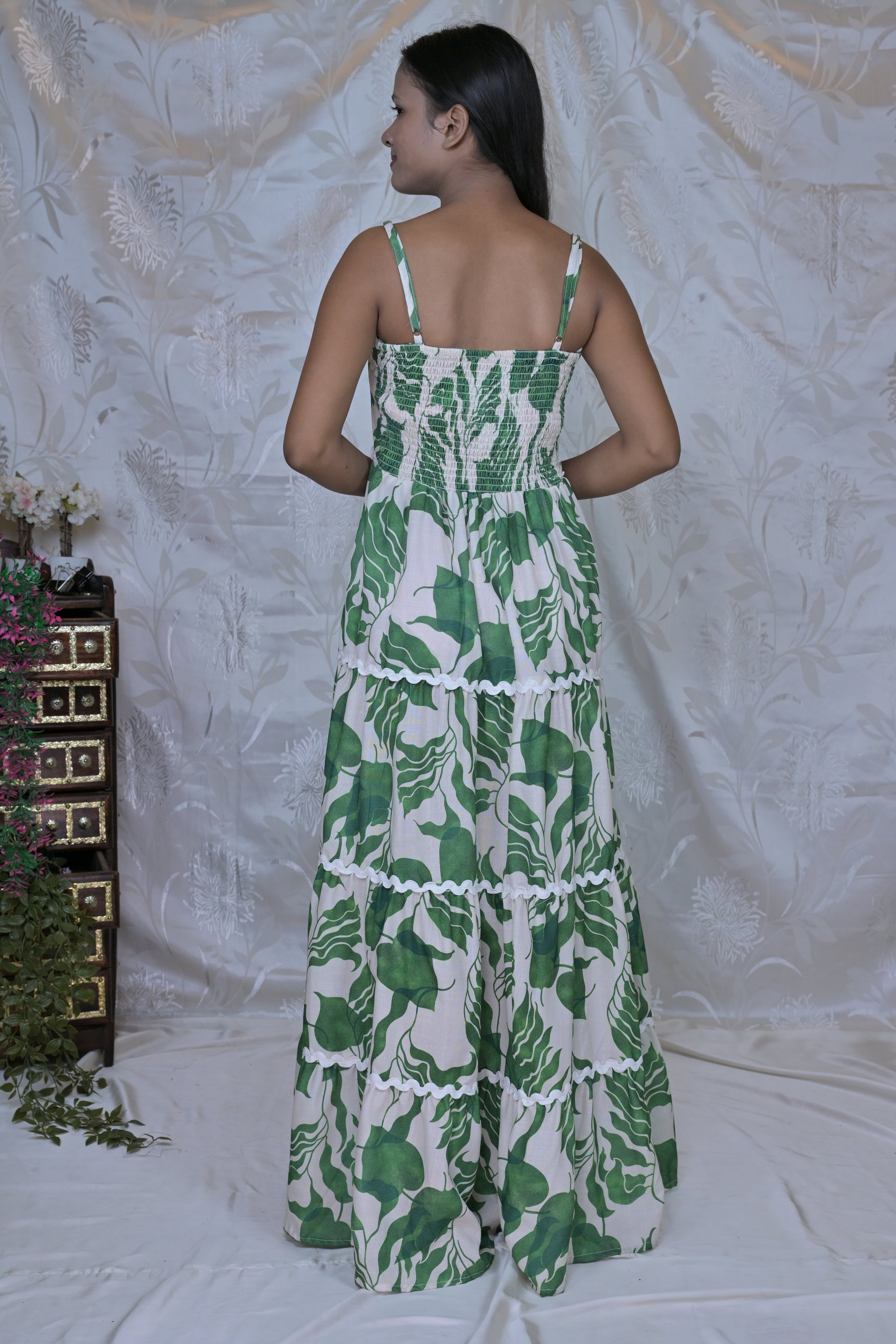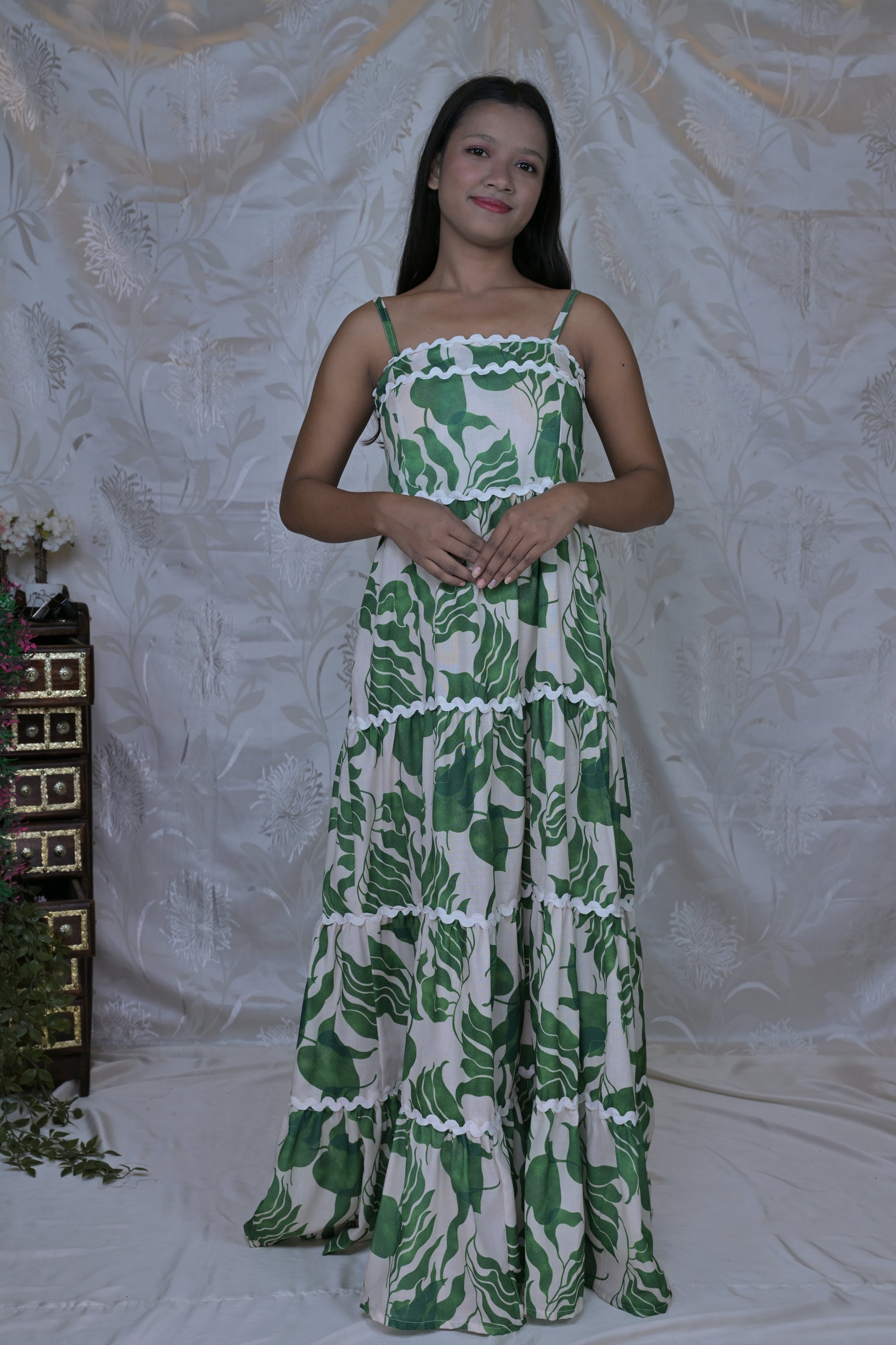Color & Design: This beautiful dress features a serene and sophisticated print, dominated by lush shades of forest green and moss green, set against a soft, creamy off-white or light beige background. The print showcases large, organic leaf motifs, reminiscent of tropical foliage, creating a harmonious and natural aesthetic. The dress is meticulously designed with a tiered skirt, where each tier is gracefully separated by delicate white scallop-edged trim, adding a charming and subtle detail that enhances its flow and movement.