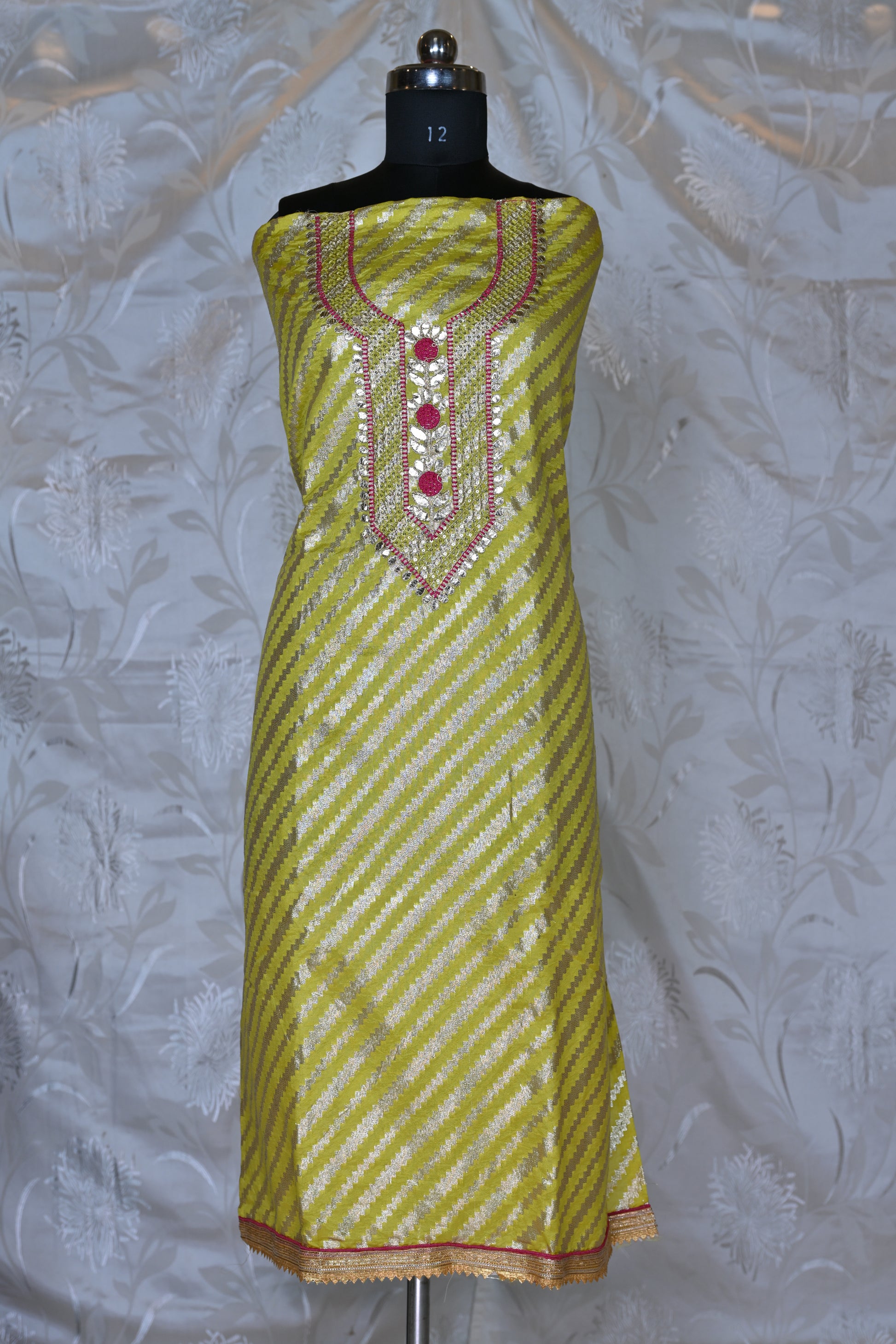 Make a striking statement with this unstitched suit set, combining traditional weaves with intricate embellishments. The kurta (top) is crafted from a beautiful fabric featuring a subtle leheriya (tie-dye wave) pattern in shades of lime green and off-white/gold, giving it a dynamic and refreshing appeal.