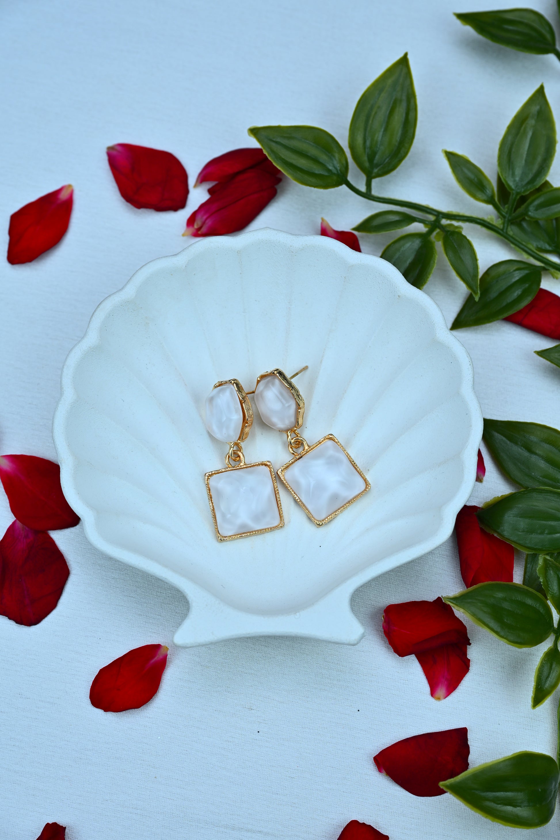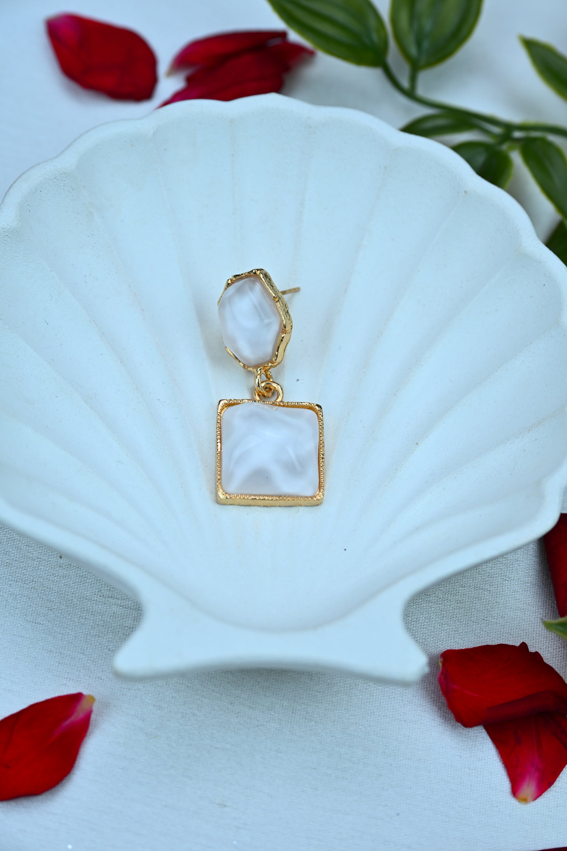 Turn heads with our White Luxe Drop Earrings — a chic, geometric statement piece featuring a marbled lavender resin set in a gleaming gold frame. The top hexagonal stud and square drop create a modern silhouette that’s effortlessly stylish.