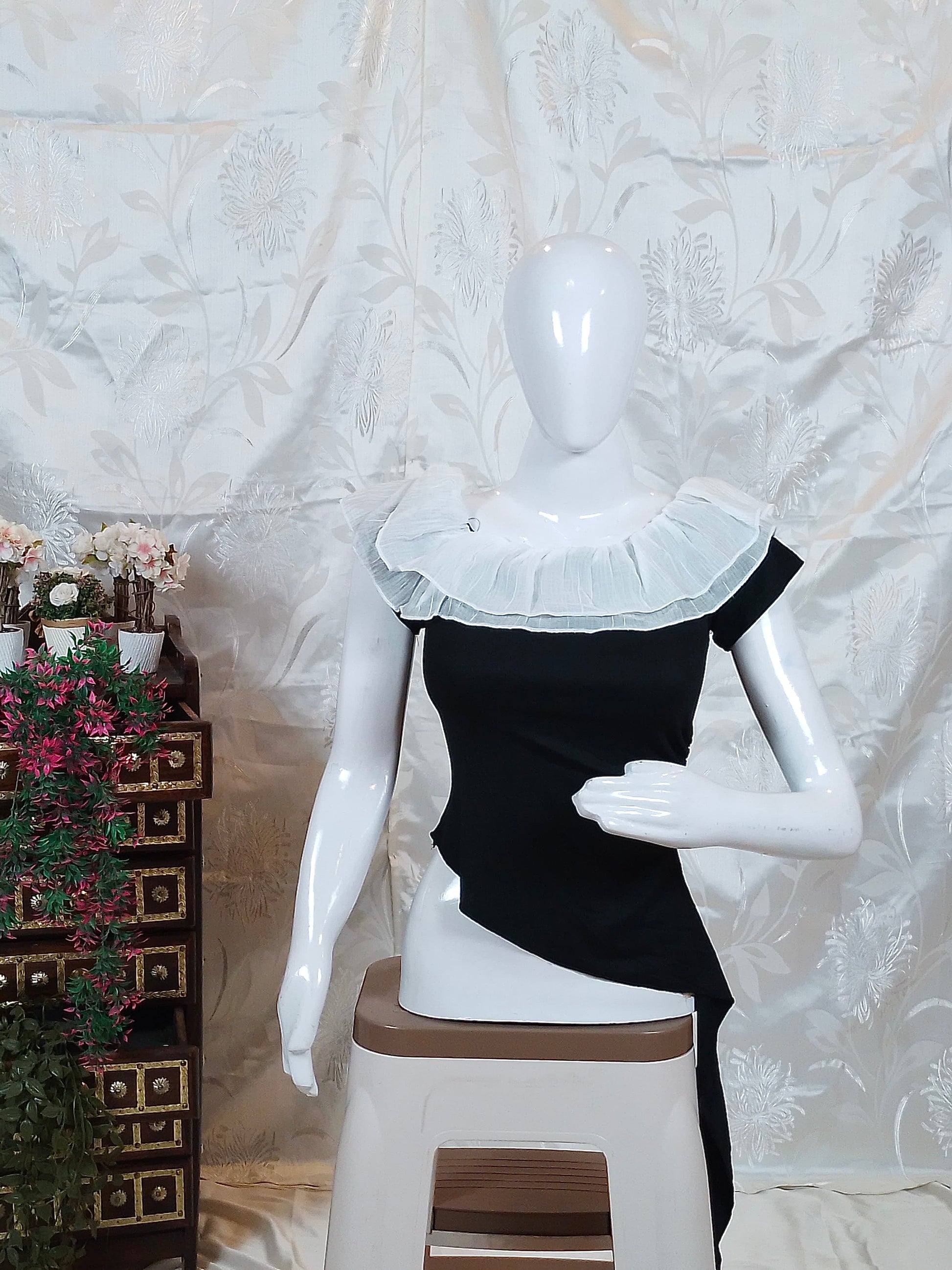 Why you'll love it: Combining a sophisticated black base with a contrasting ruffled collar and an edgy asymmetrical hem, this top is a must-have for those who dare to be different, offering a blend of elegance and modern design.