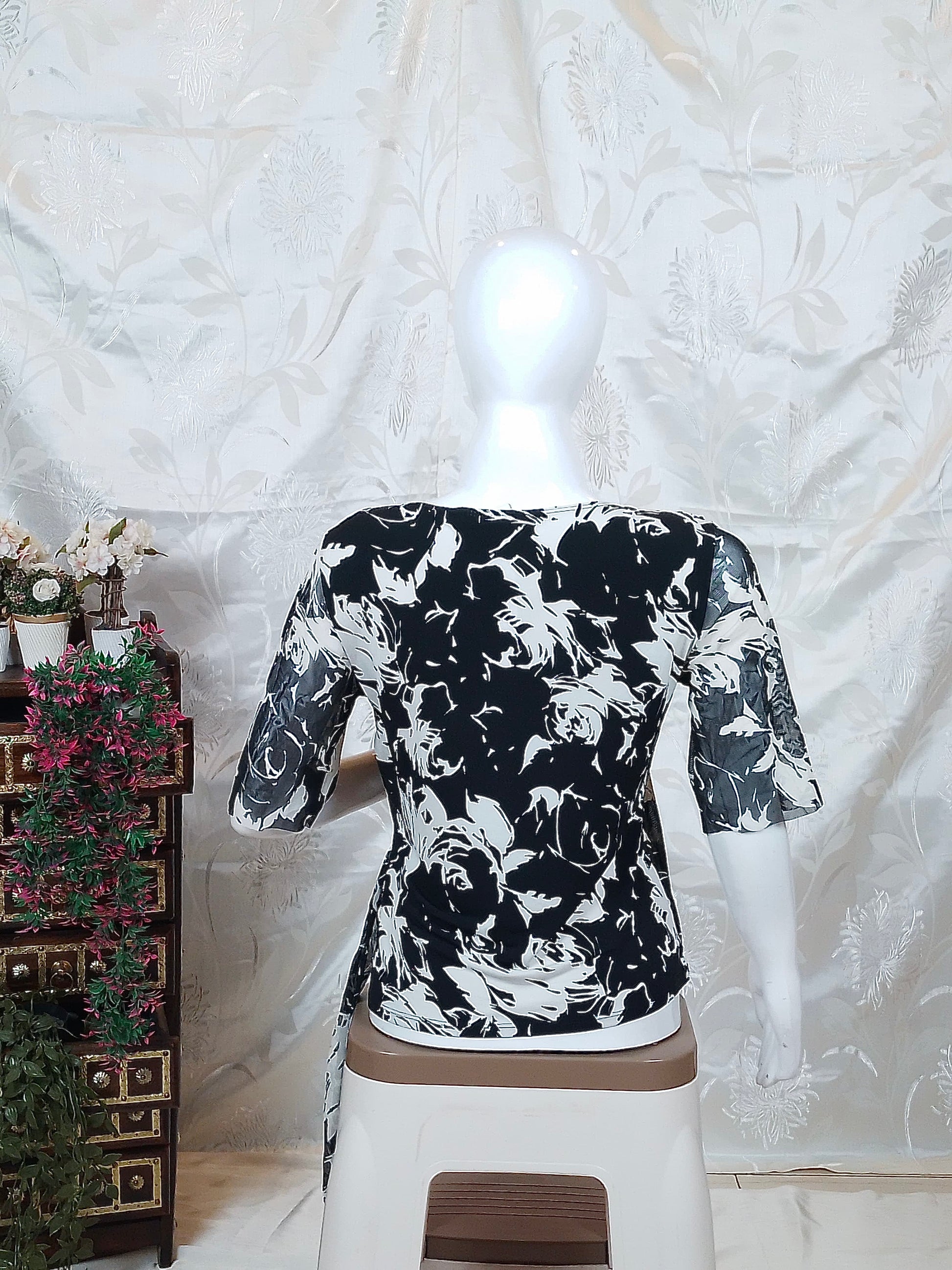 Product Details: Add a touch of modern sophistication to your wardrobe with this stylish black and white floral printed mesh top from The cloud store . Designed with a unique tie-up front, this sheer top offers a chic and contemporary look perfect for various occasions.
