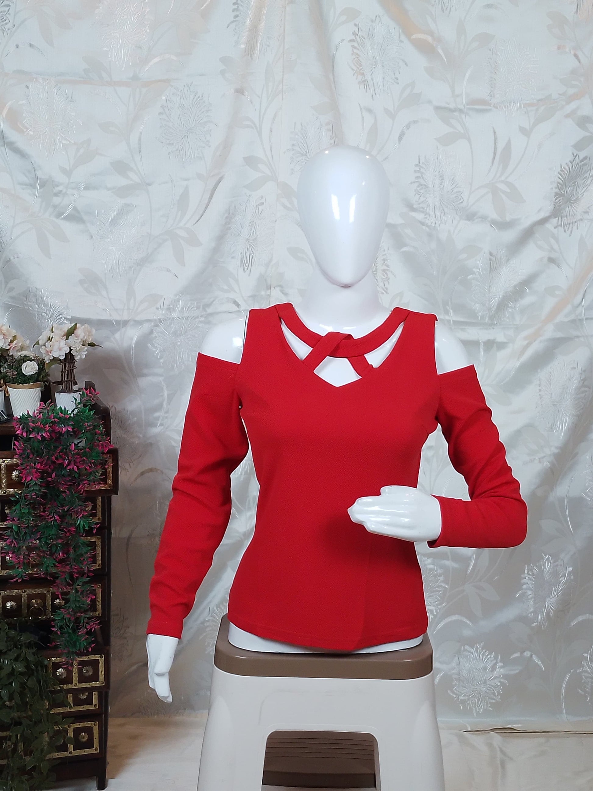 Product Details: Make a striking fashion statement with this vibrant red solid cold-shoulder top. Designed with modern cutouts and a flattering silhouette, this top is perfect for adding a bold and trendy touch to your ensemble.